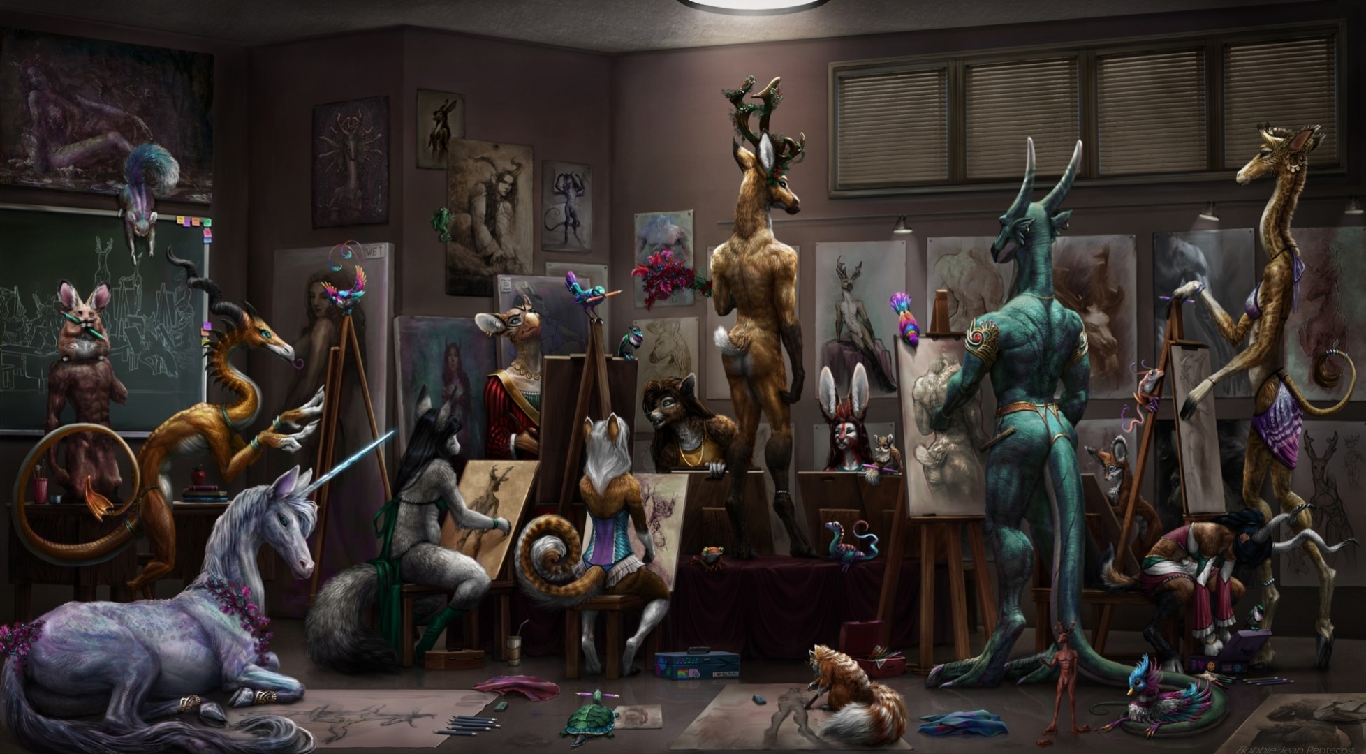 Tiermaler hinter staffeleien schreiben porträts von einhörnernTiermaler hinter Staffeleien schreiben Porträts von Einhörnern