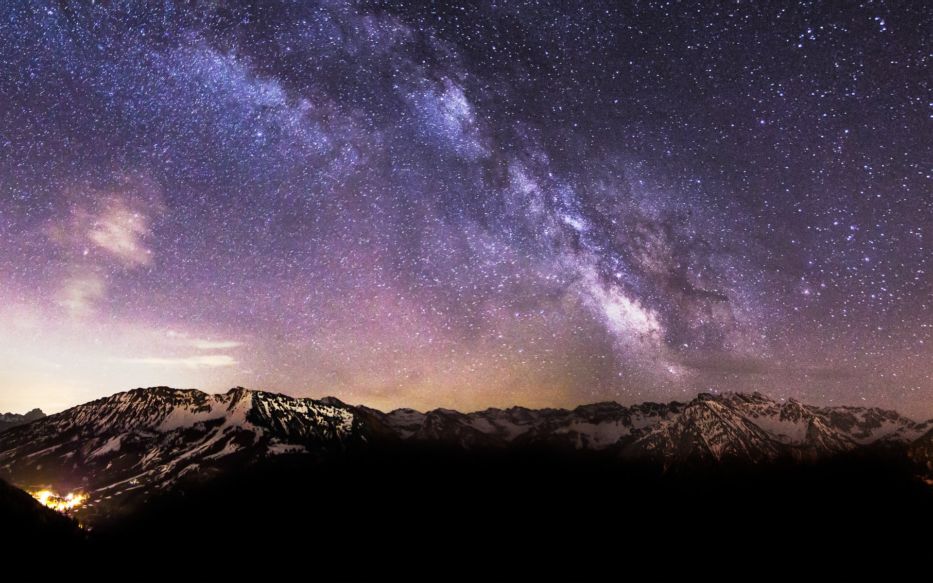 Der Nachthimmel in Deutschland. Berge im Schnee
