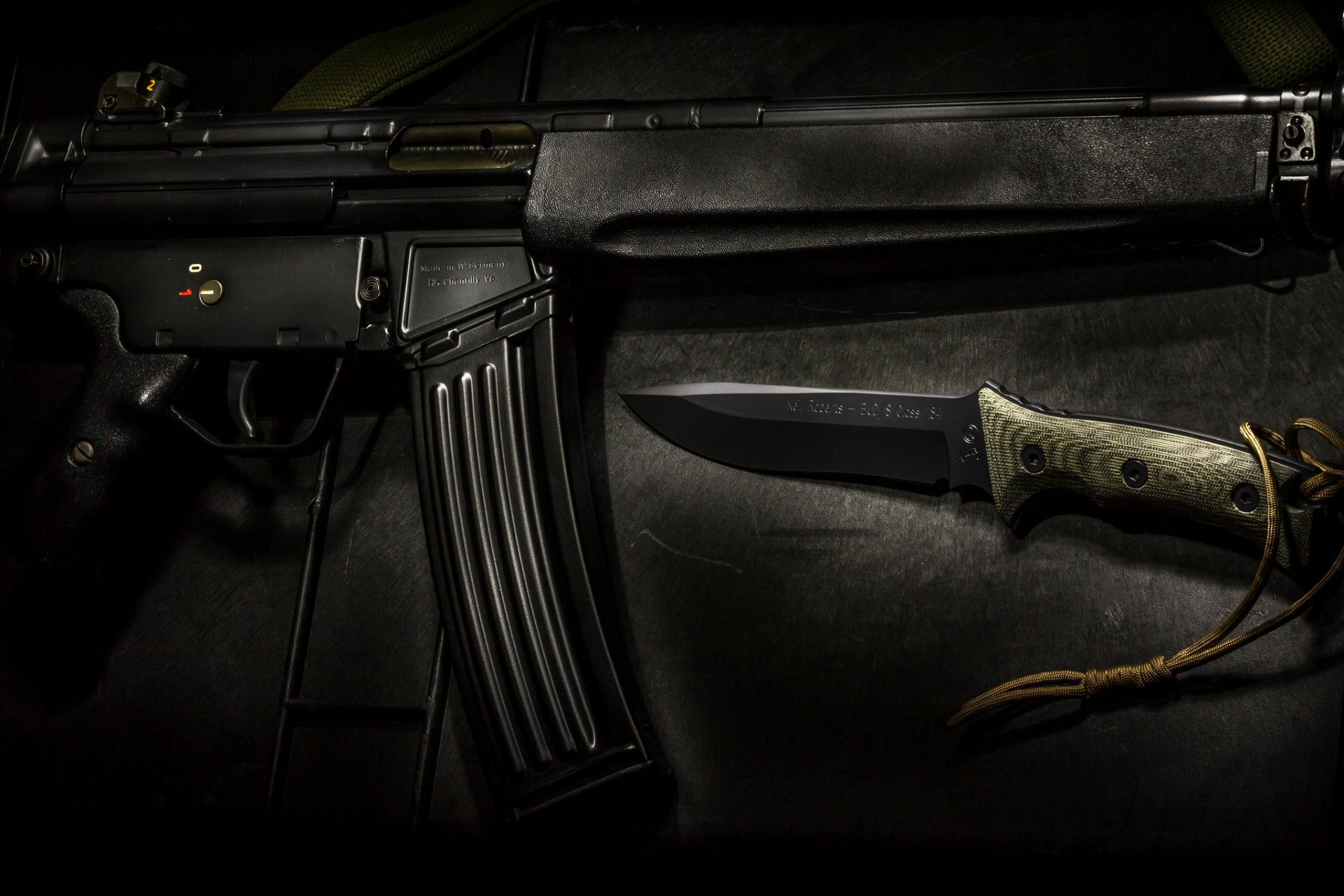 Im Hintergrund ein Sturmgewehr mit einem Messer