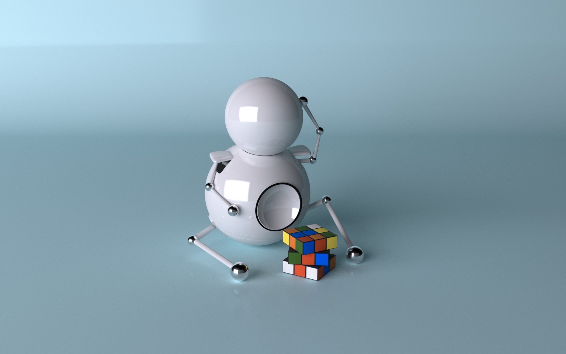 Ein kleiner Roboter sitzt über einem Zauberwürfel