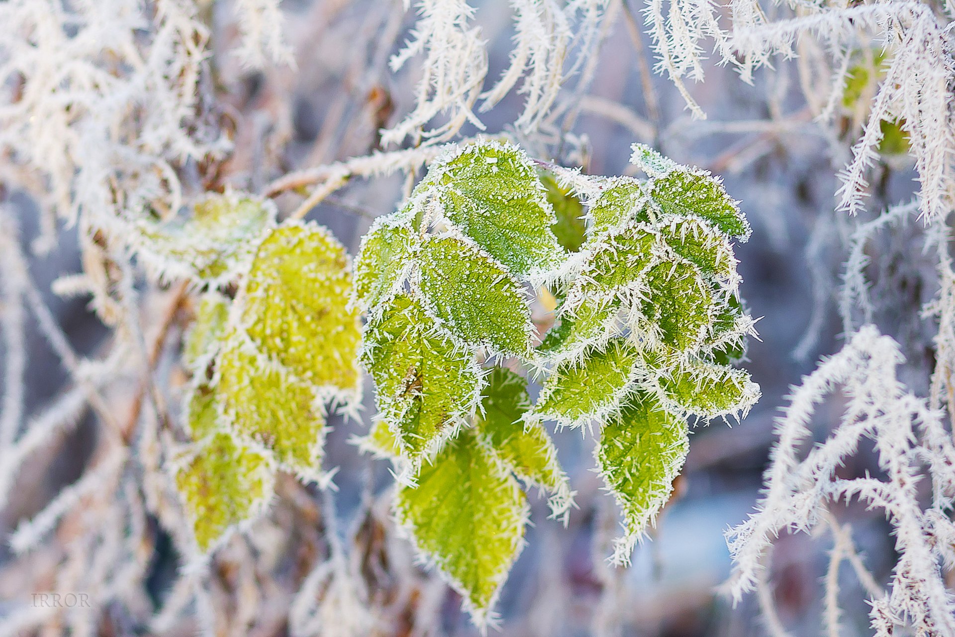 Grüne Blätter auf einem Ast im Frost