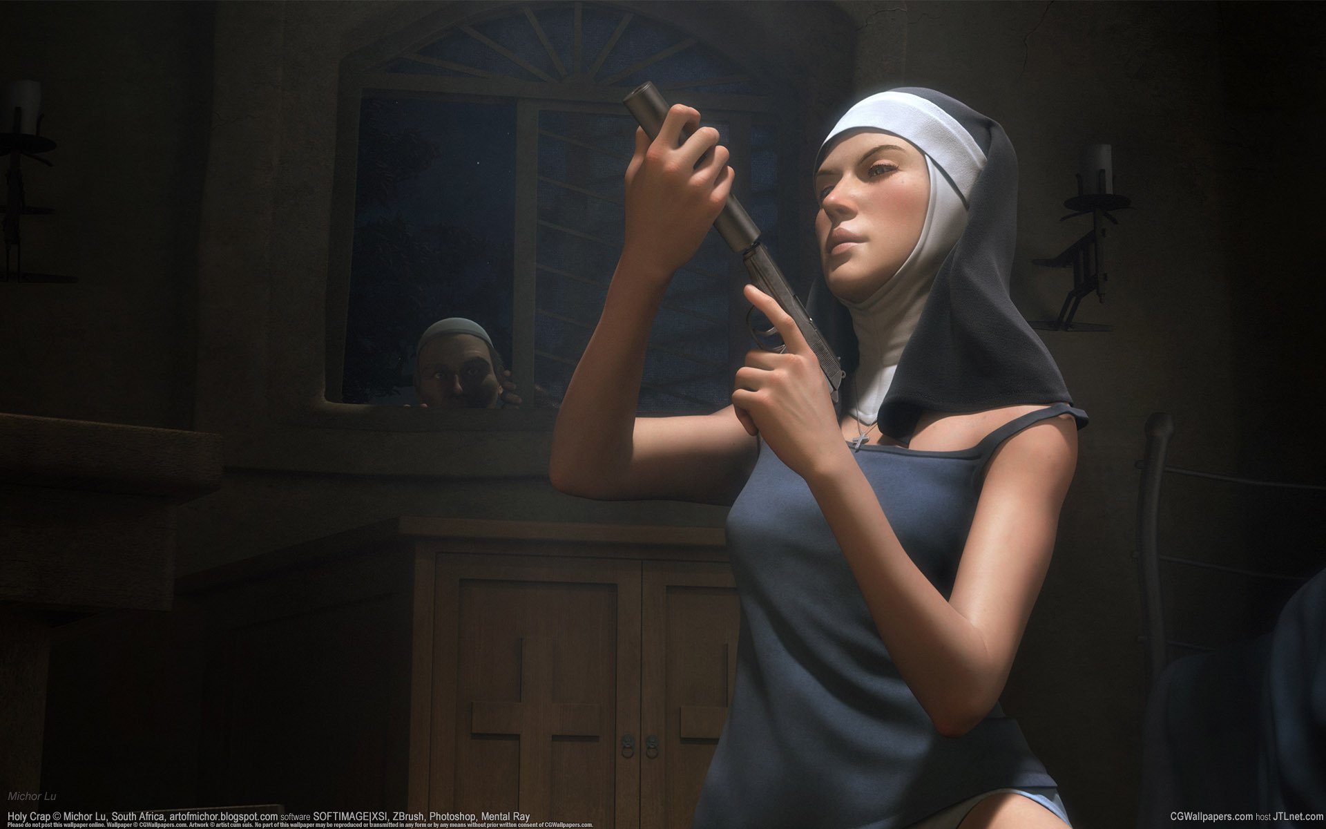Mädchen in T-Shirt und Nonnen-Kopfbedeckung, mit Pistole