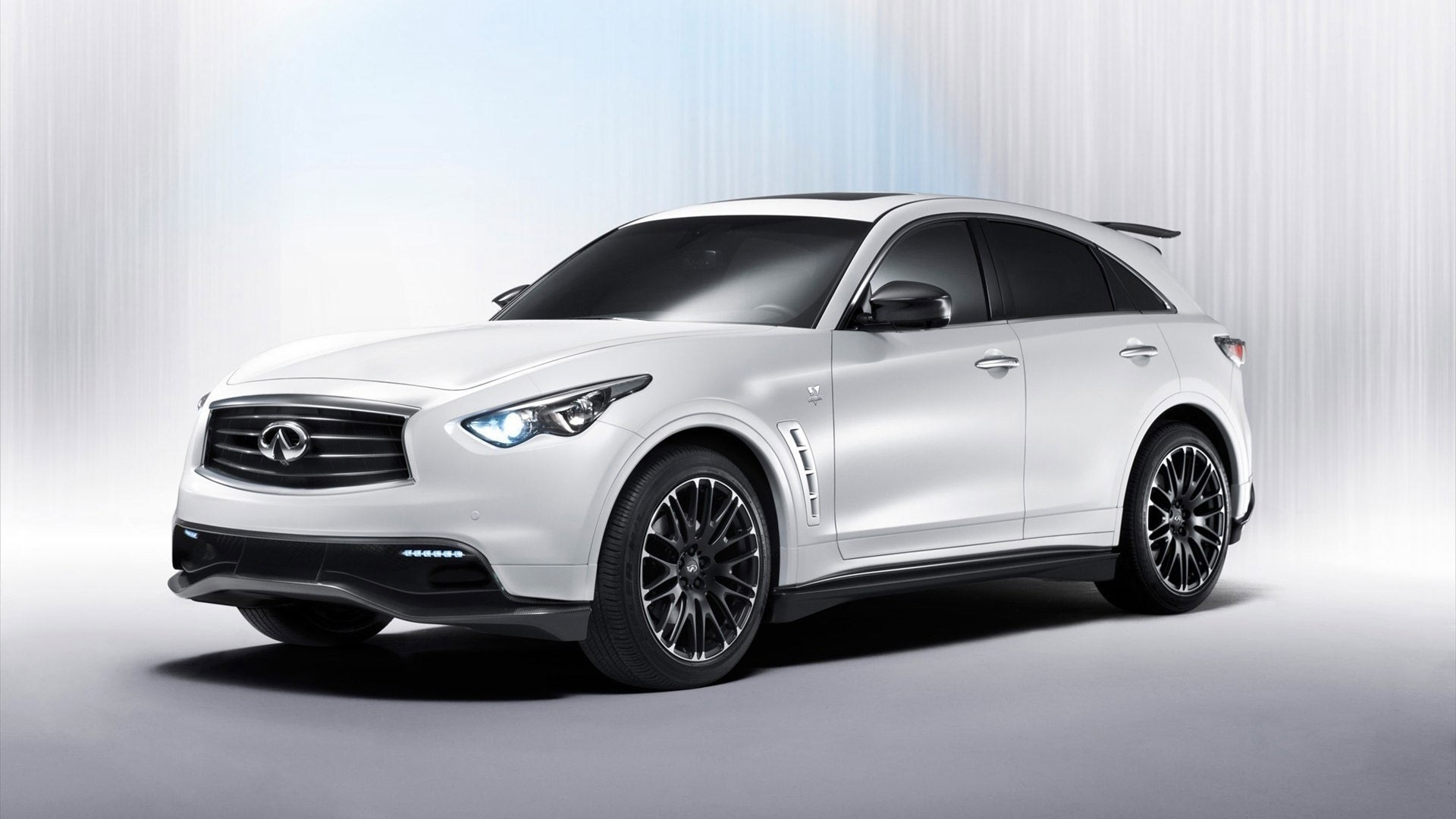 Weißer infiniti auf dem hintergrund der stadtlandschaftWeißer Infiniti auf dem Hintergrund der Stadtlandschaft