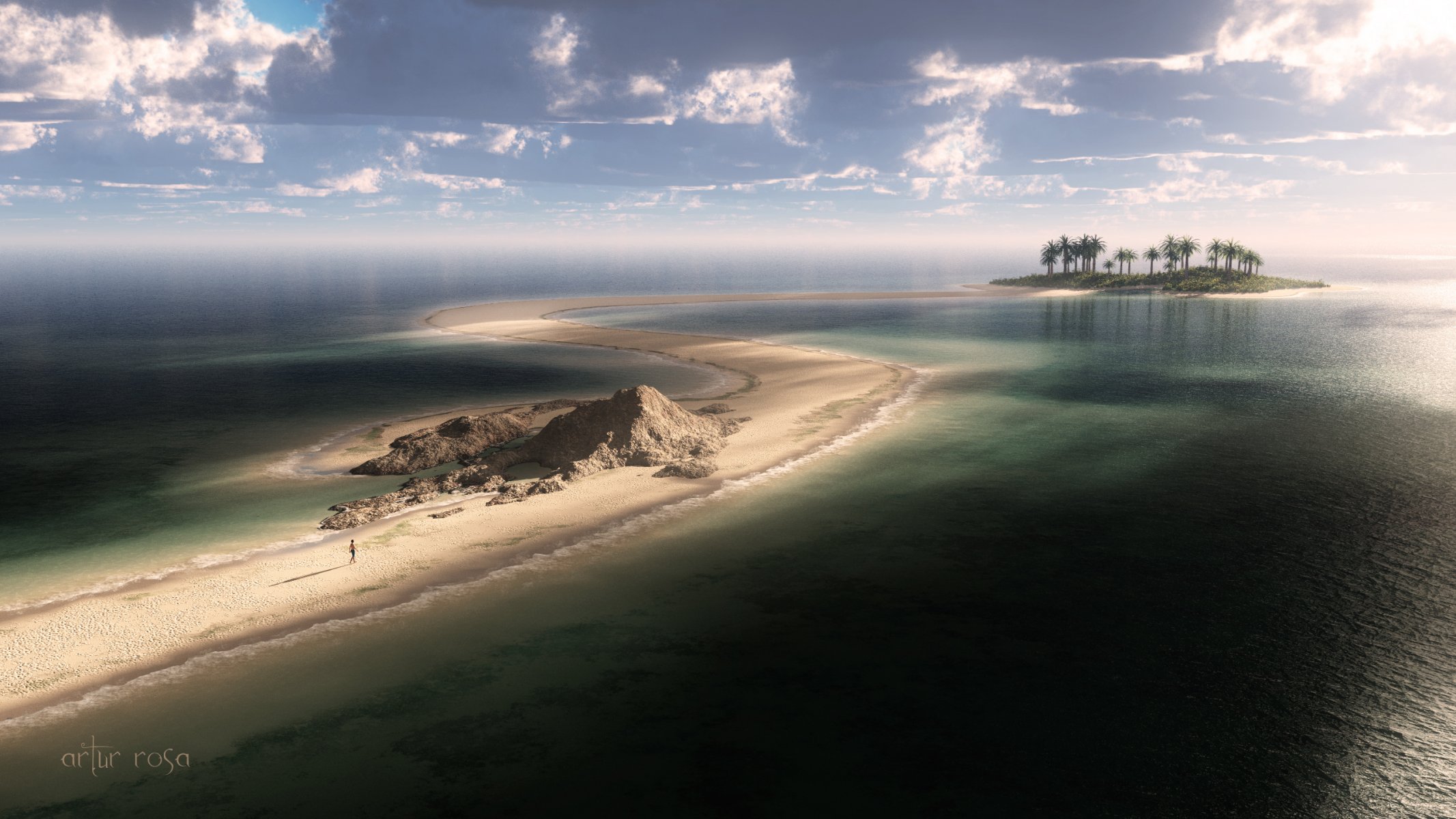 Ein mann auf einer schwebenden insel in shorts und westeEin Mann auf einer schwebenden Insel in Shorts und Weste