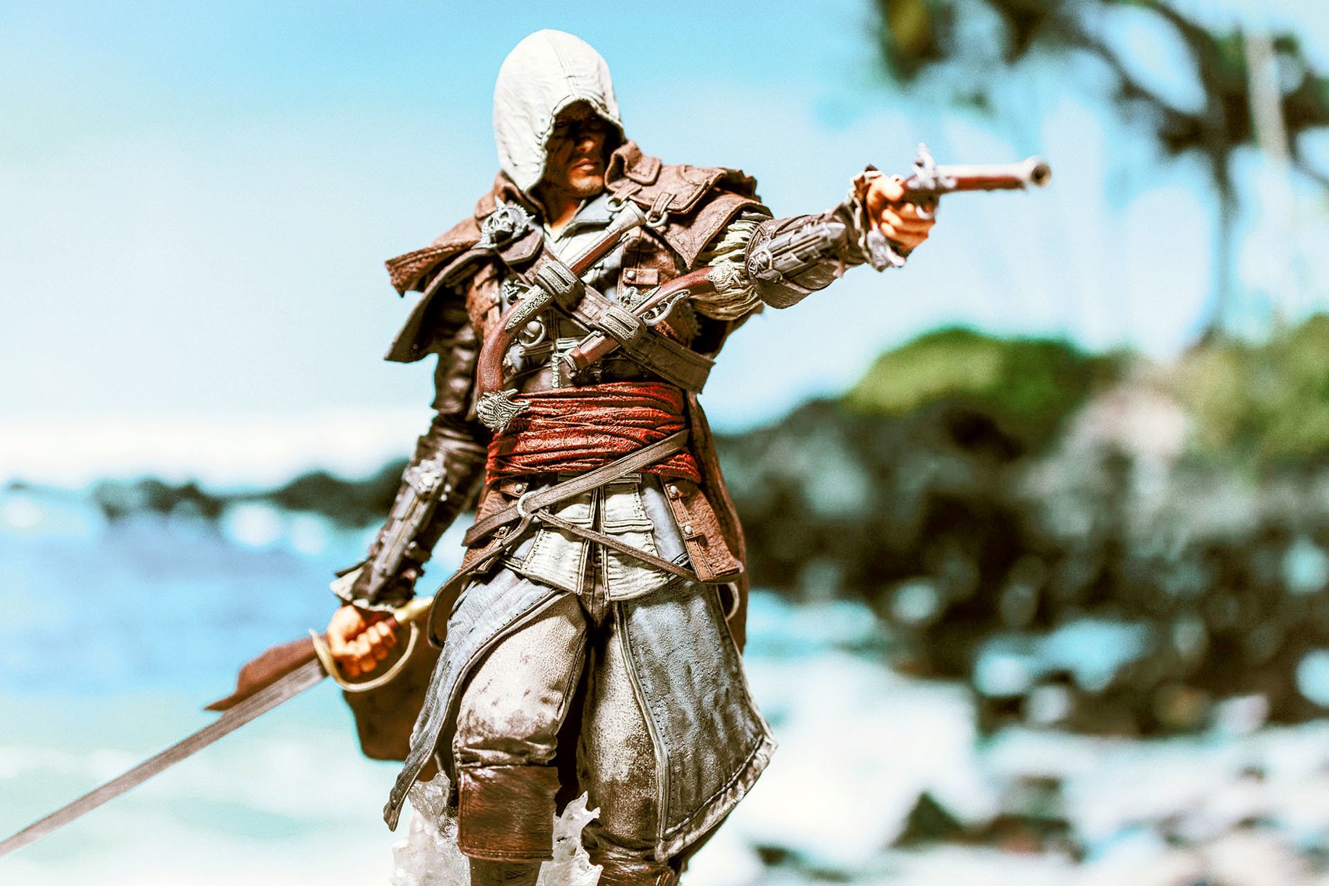 Ein Charakter aus einem Computerspiel mit einer Waffe auf einem Hintergrund von Schiffen