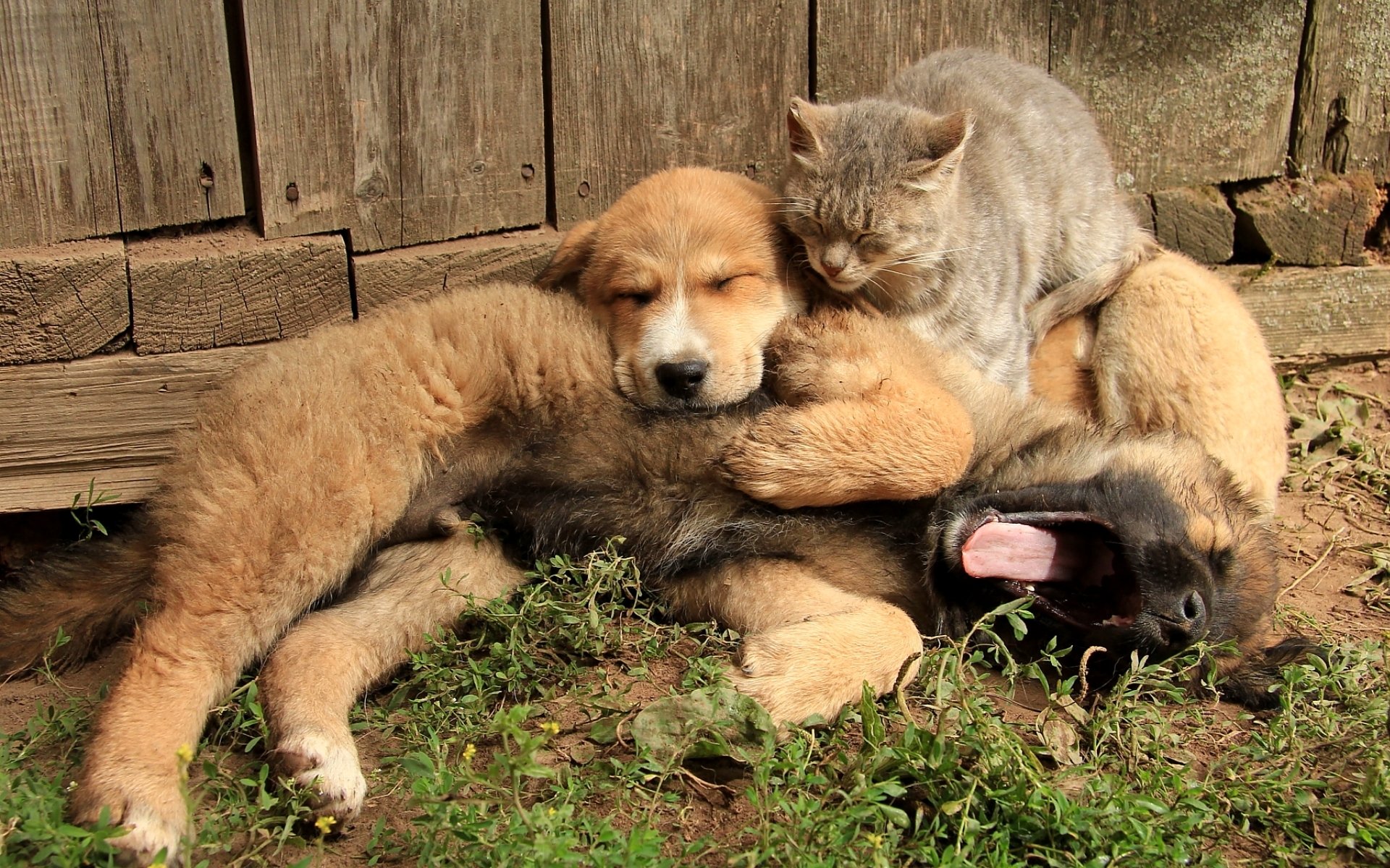 Auf einem großen Hund liegen ein Hund und eine Katze