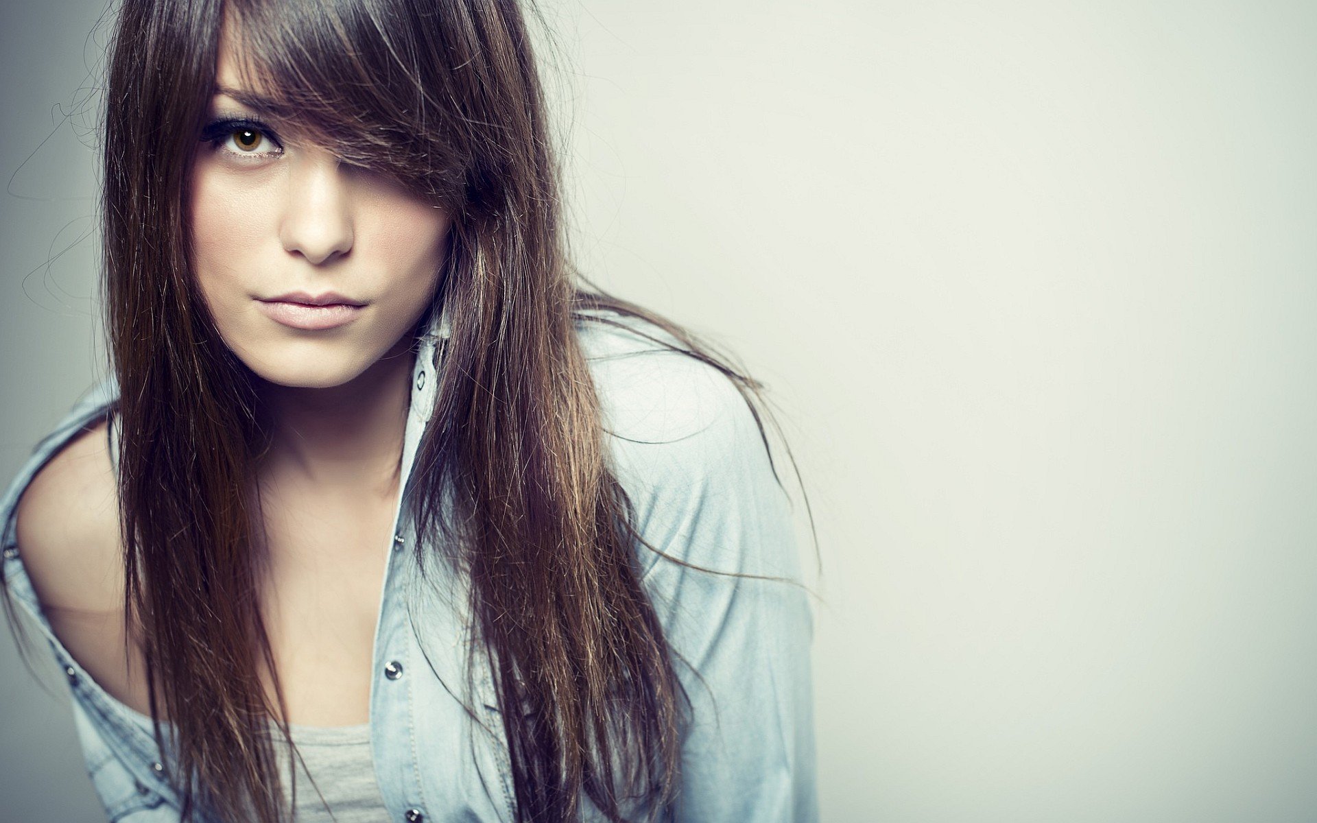 Mädchen mit langen schwarzen Haaren in T-Shirt und Hemd auf einem einfarbigen Hintergrund
