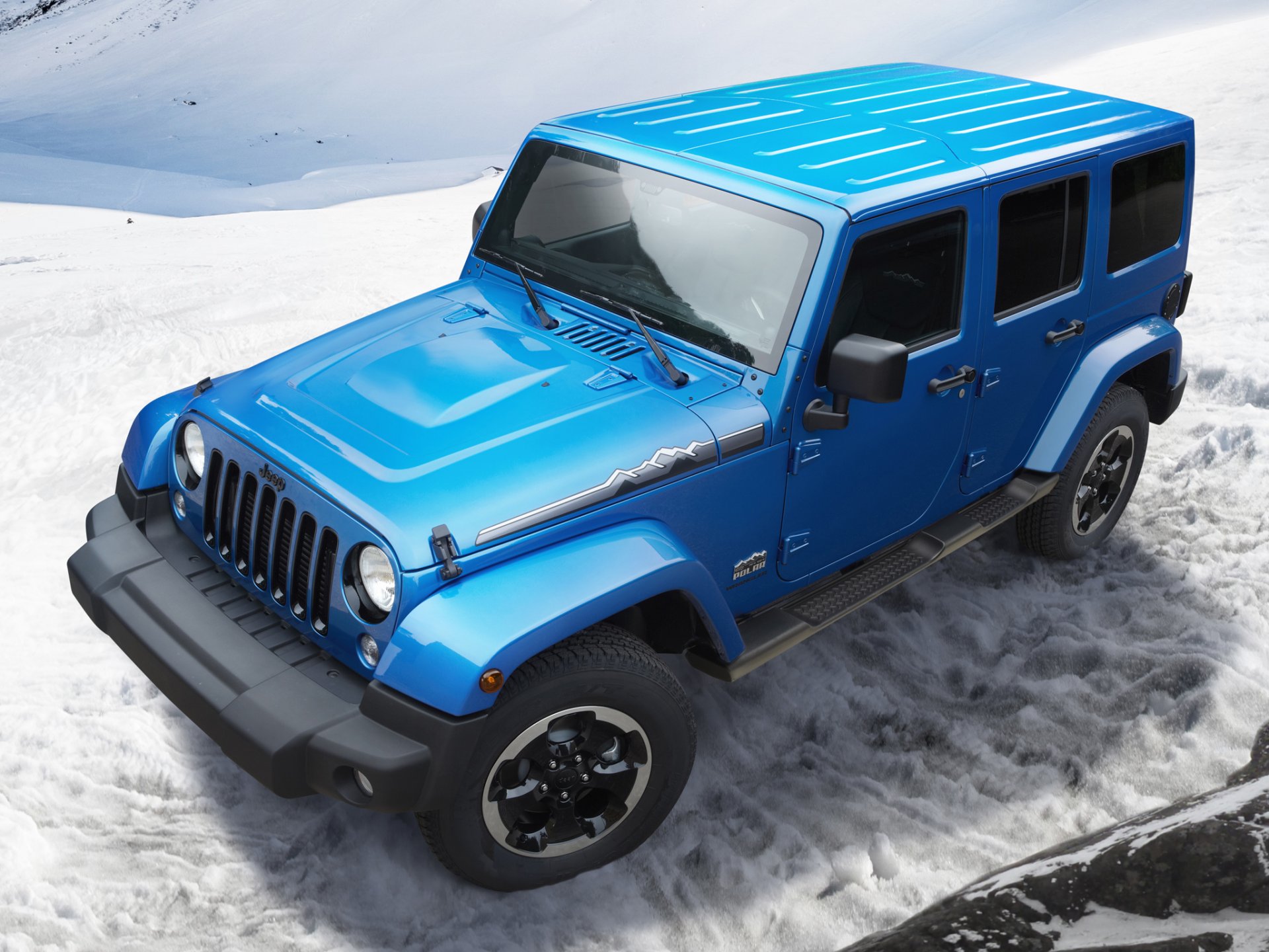 Blauer wrangler-jeep in den schneebedeckten bergenBlauer Wrangler-Jeep in den schneebedeckten Bergen