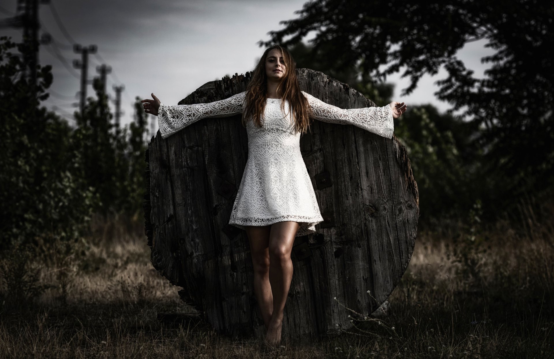 Schönes Mädchen im weißen Kleid posiert im Wald