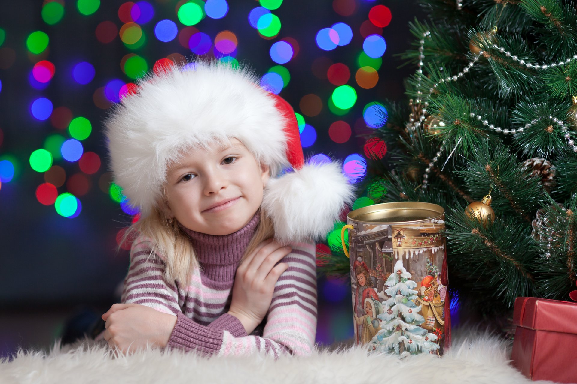 Mädchen mit Pelzmütze am Weihnachtsbaum
