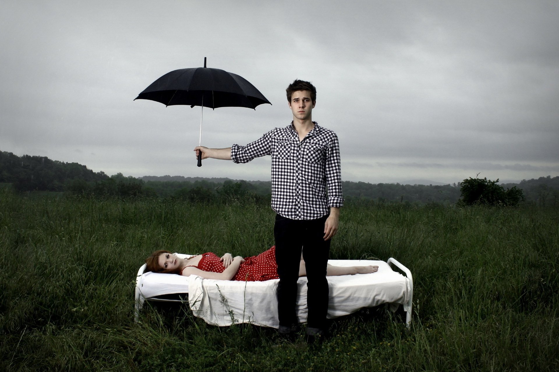 Ein mann hält einen regenschirm über ein liegendes mädchenEin Mann hält einen Regenschirm über ein liegendes Mädchen