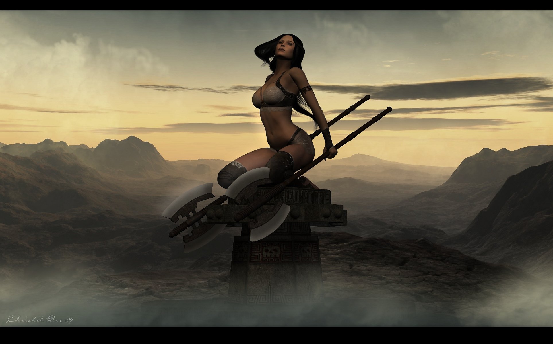 Rendering eines mädchens mit einer axt auf schwarzem hintergrundRendering eines Mädchens mit einer Axt auf schwarzem Hintergrund