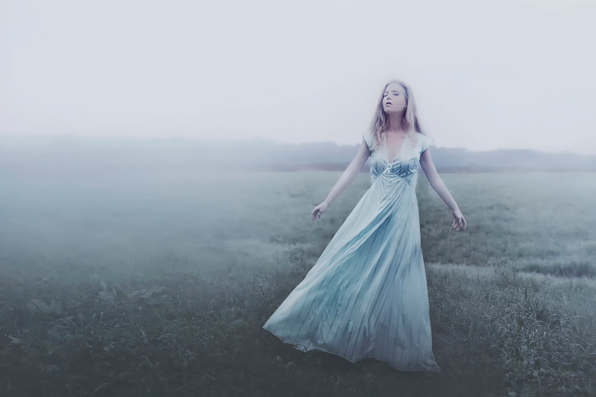 Ein mädchen in einem langen kleid steht im nebel auf einem feldEin Mädchen in einem langen Kleid steht im Nebel auf einem Feld