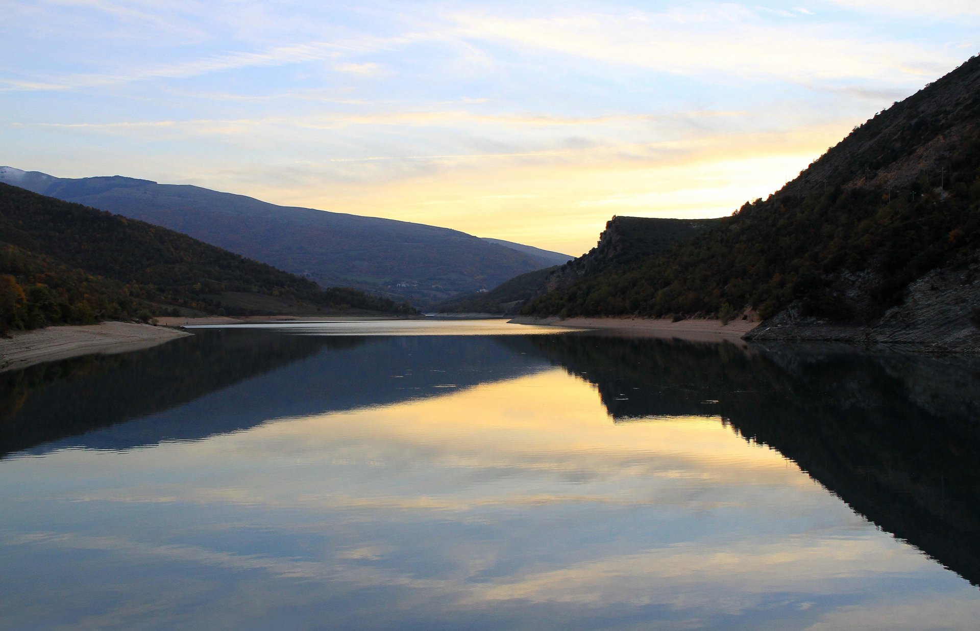 Ein See, der von Feldern in der untergehenden Sonne umgeben ist