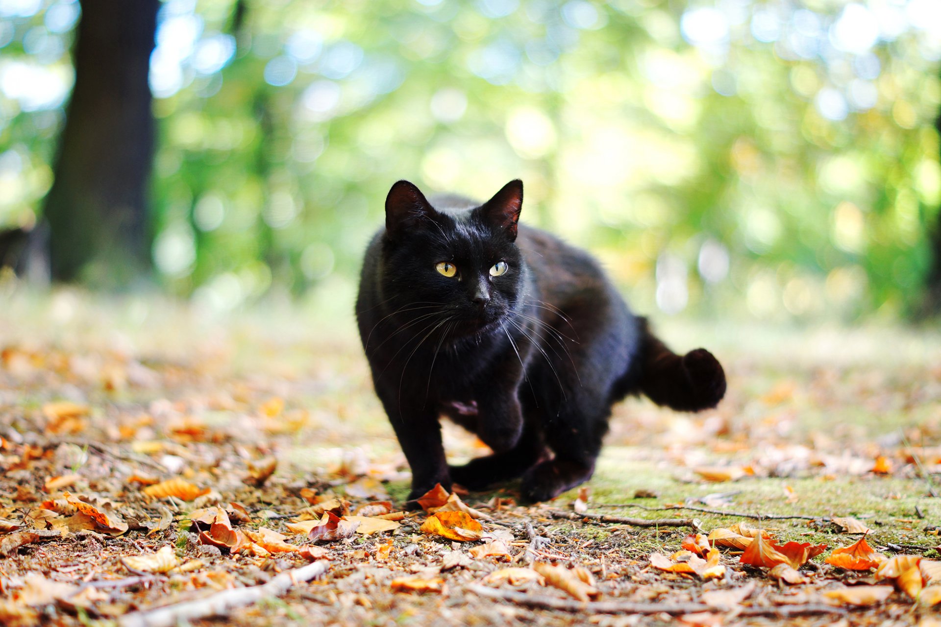 Schwarze Katze im Herbstlaub