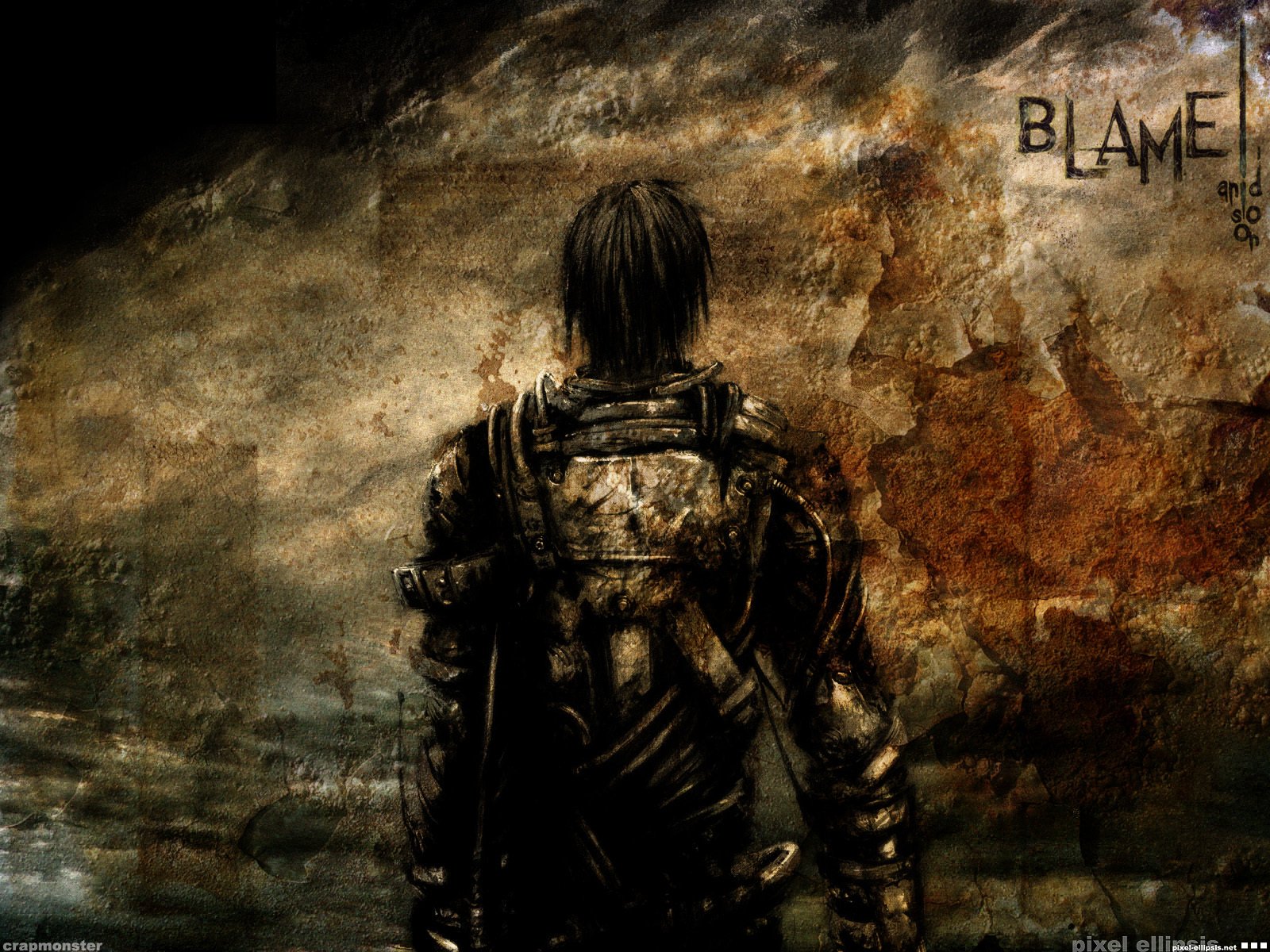 Anime blame kerl steht auf dem rücken