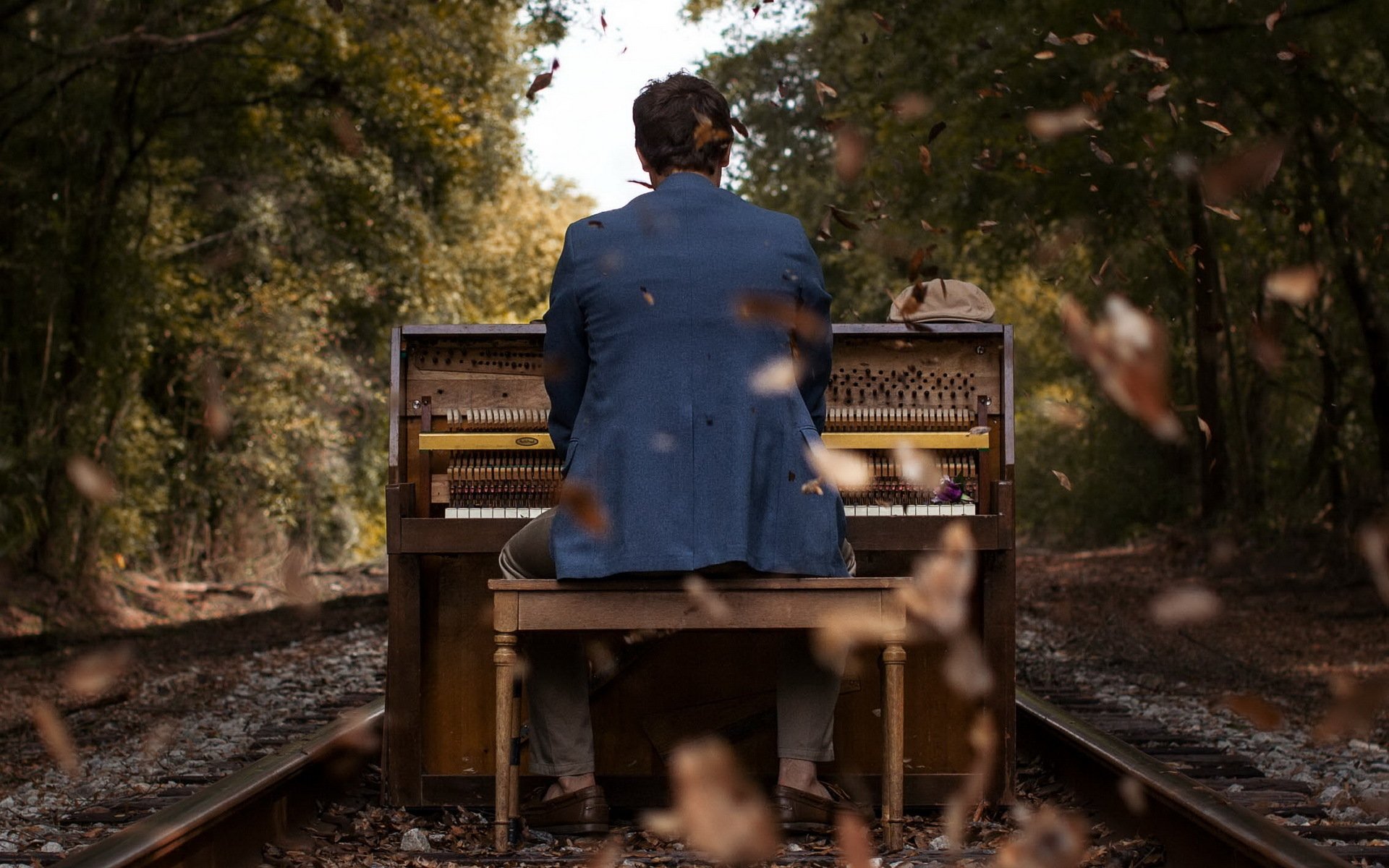 Vor dem hintergrund der herbstlandschaft spielt ein mann klavierVor dem Hintergrund der Herbstlandschaft spielt ein Mann Klavier