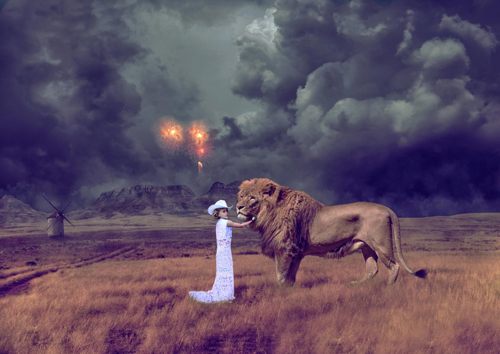 Das kleine Mädchen lief in den Wald und traf dort einen Löwen
