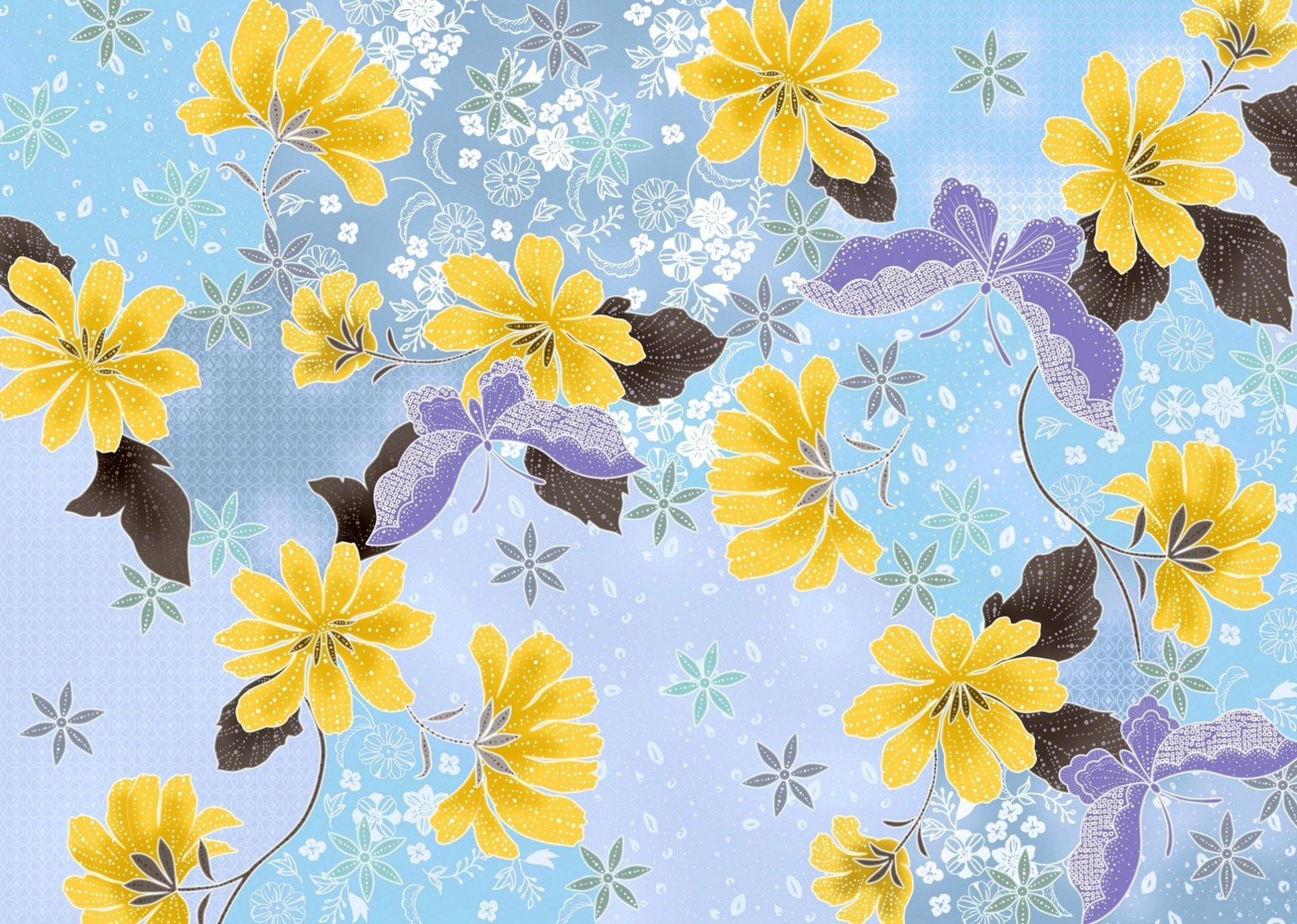 Gelbe blumen und lila schmetterlinge auf blauem hintergrundGelbe Blumen und lila Schmetterlinge auf blauem Hintergrund