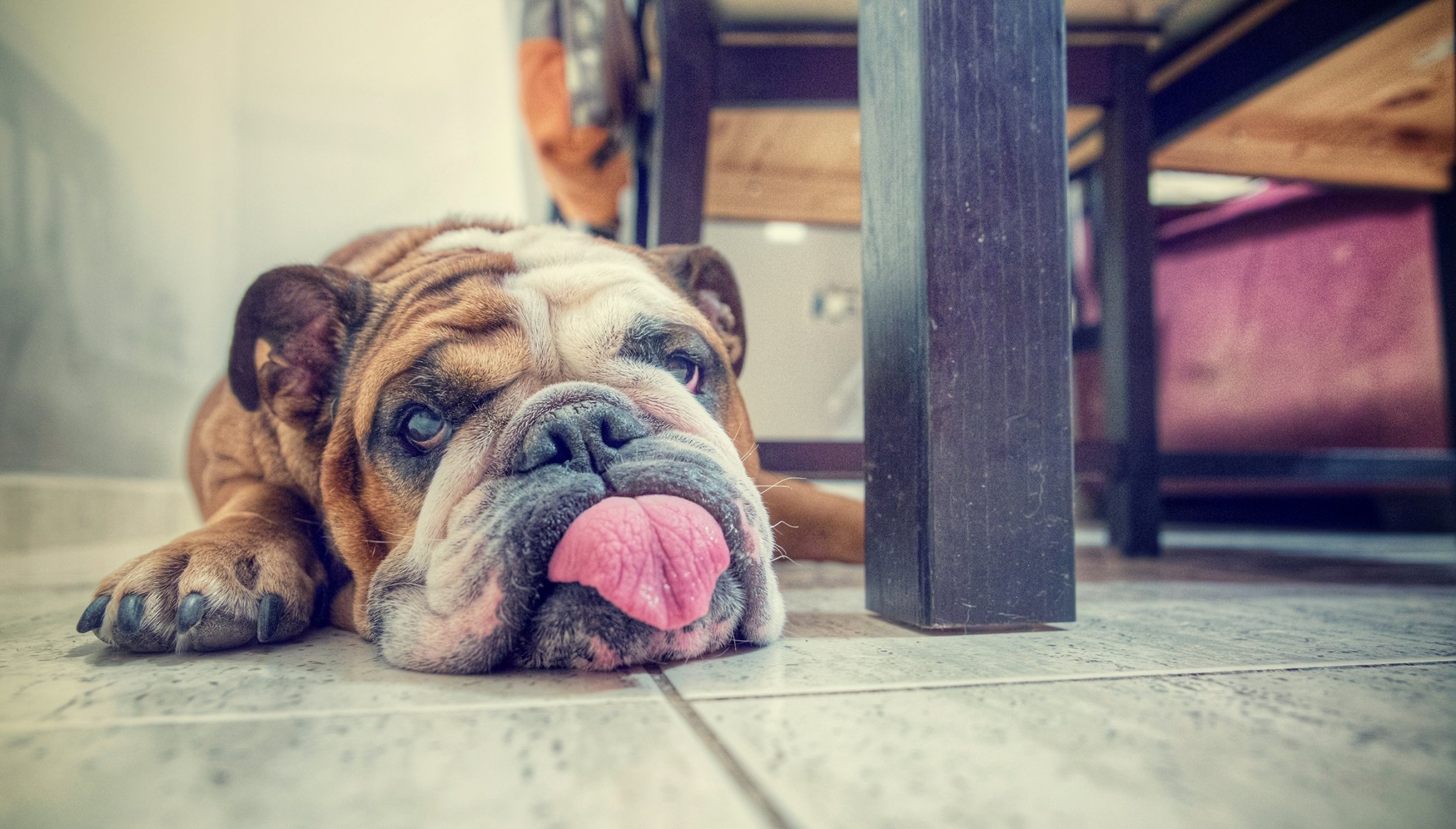 Der hund liegt mit ausgestreckter zunge auf dem bodenDer Hund liegt mit ausgestreckter Zunge auf dem Boden