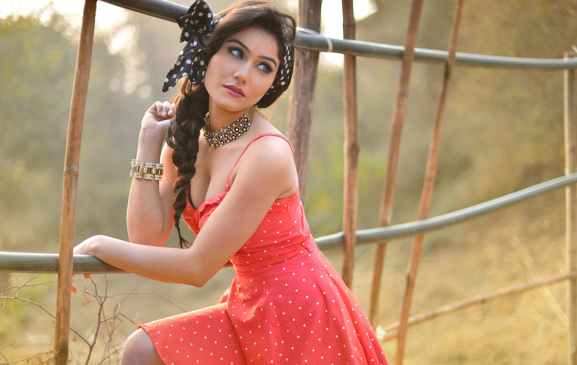 Mädchen in einem roten Kleid, schwarzen Strumpfhosen, schwarzen Schuhen, schwarzen Haaren, die auf einem weißen Sofa sitzen