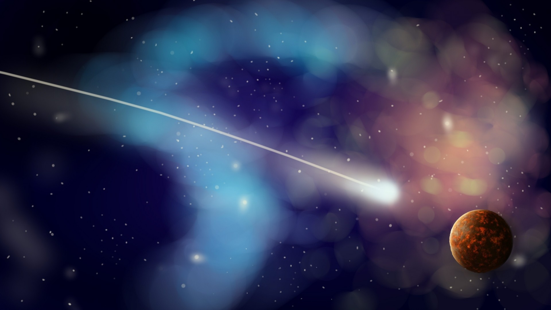 Weit weg von der Erde. Ein Komet fliegt an einem unbekannten Planeten vorbei