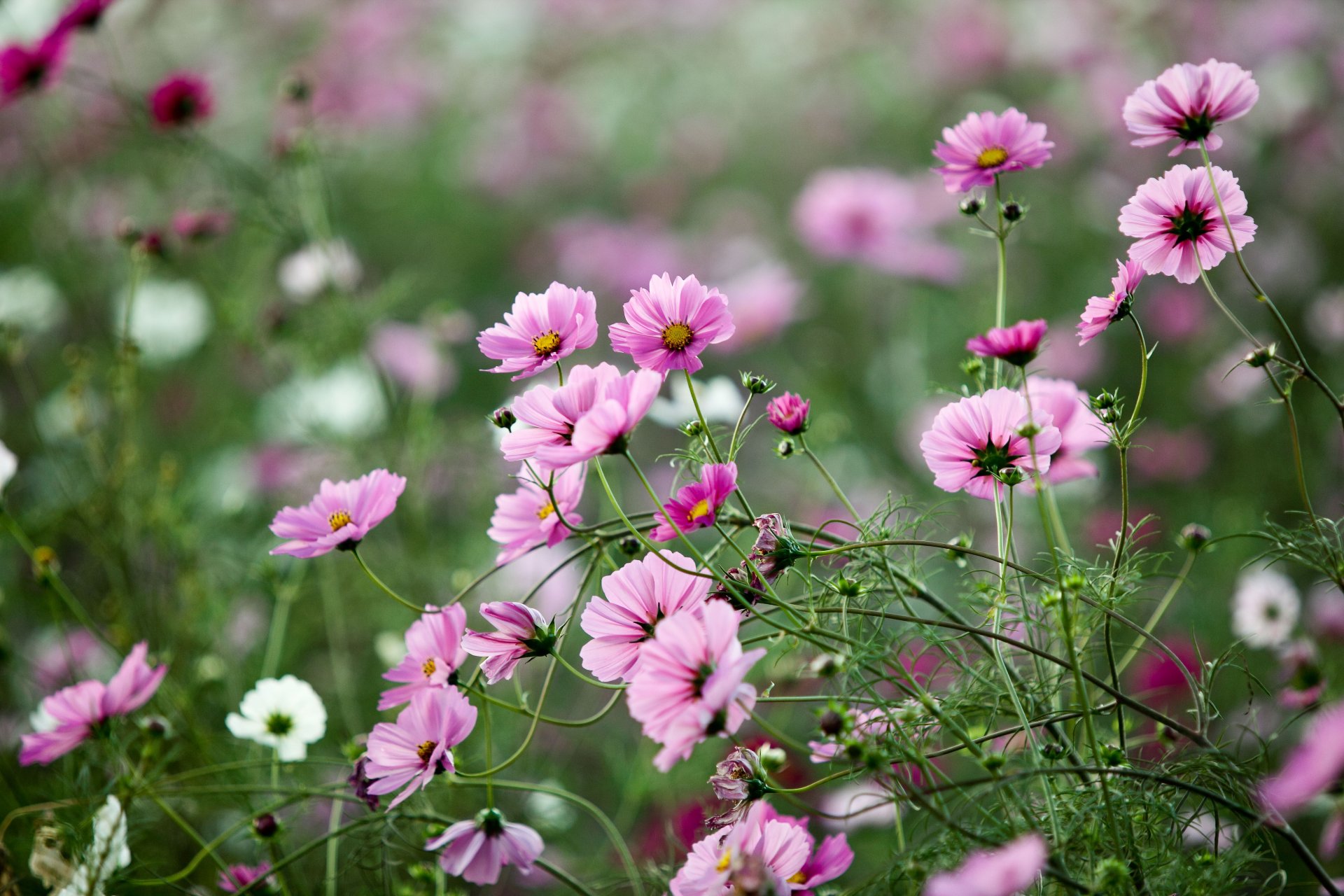 Rosa und weiße Kosmea auf einer Sonnenlichtung