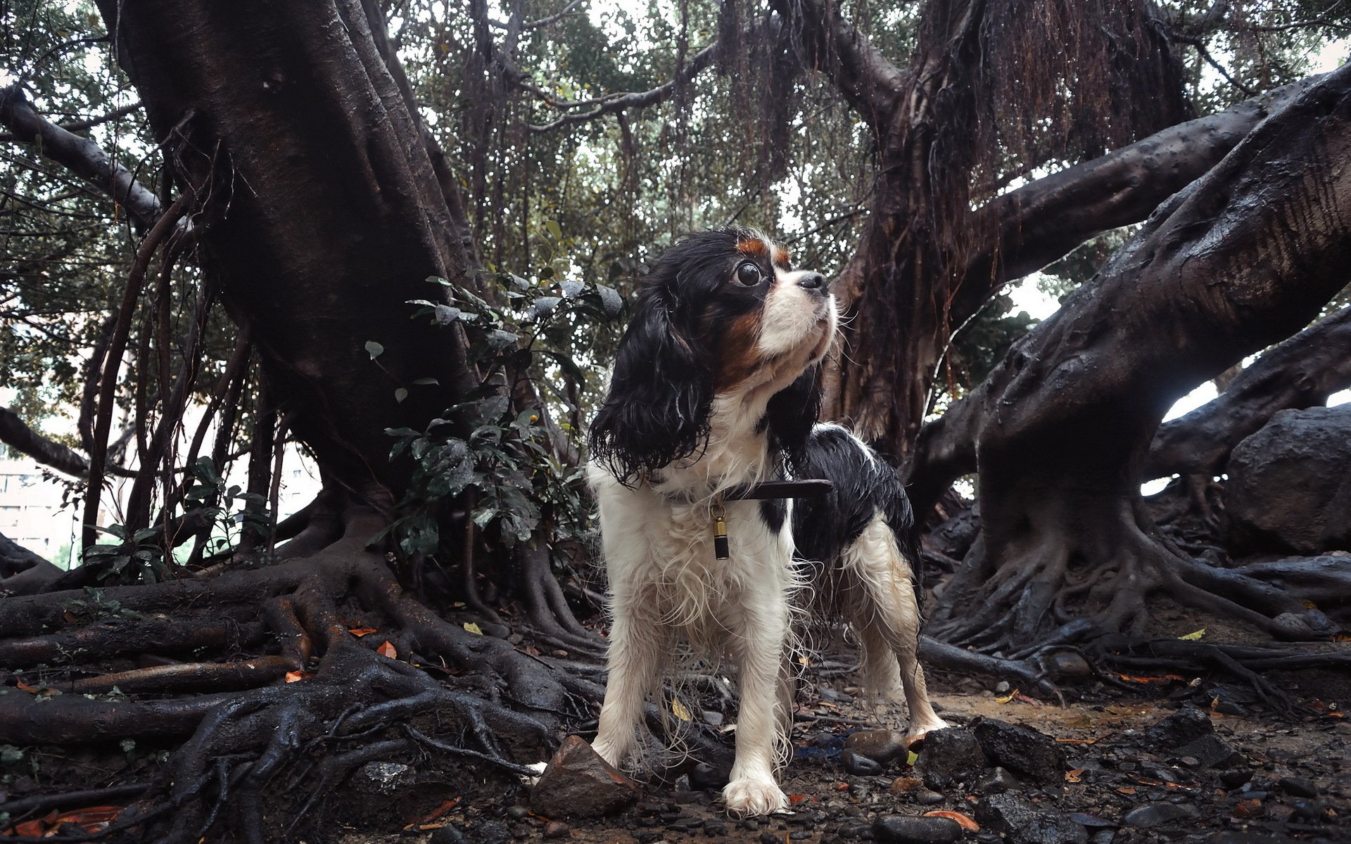 Ein hund auf einem hohen berg schaut auf die wolkenEin Hund auf einem hohen Berg schaut auf die Wolken