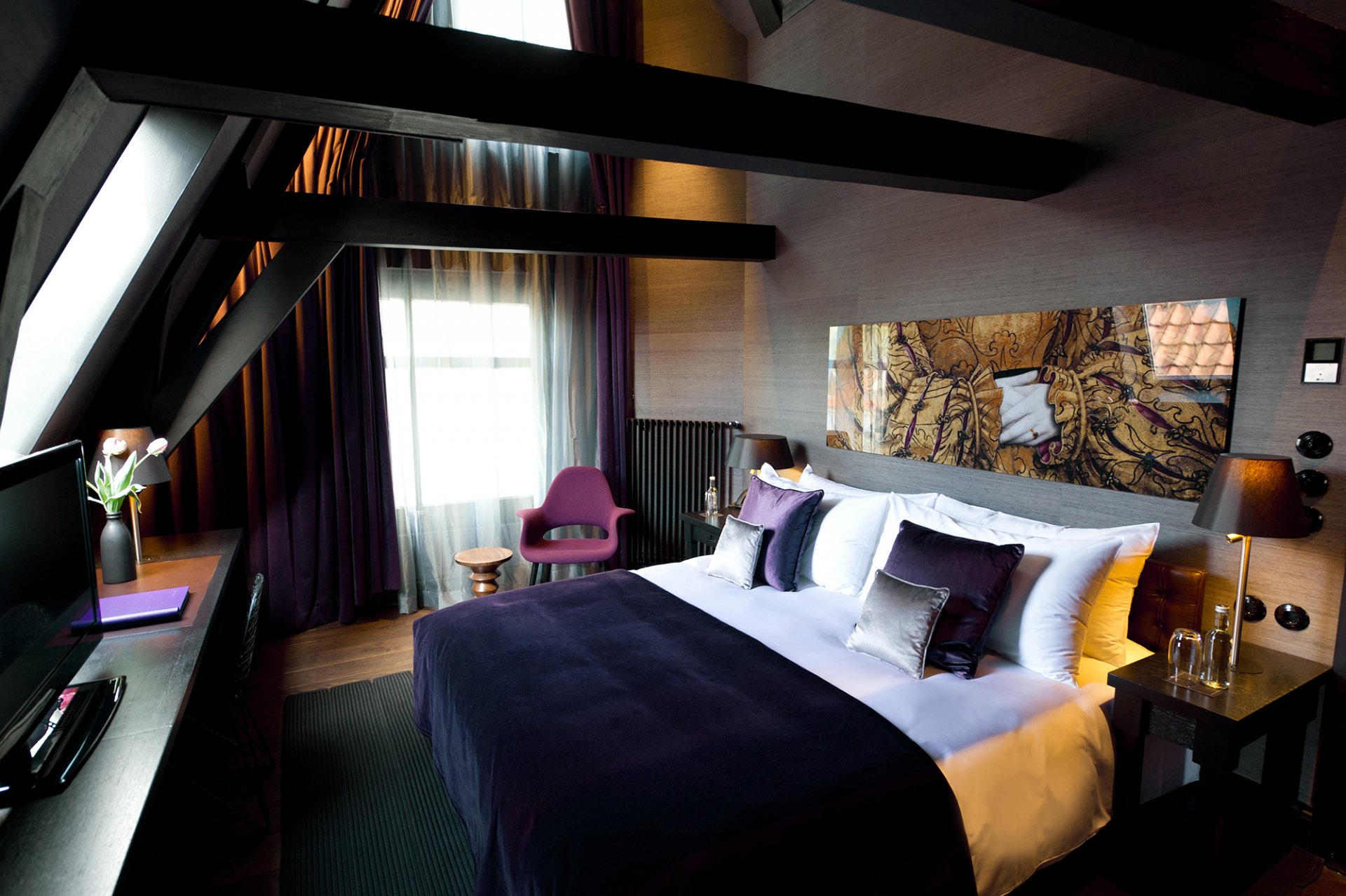 Schlafzimmer im modernen stil mit einem doppelbett unter der roten decke und einer sitzecke im erkerfensterSchlafzimmer im modernen Stil mit einem Doppelbett unter der roten Decke und einer Sitzecke im Erkerfenster