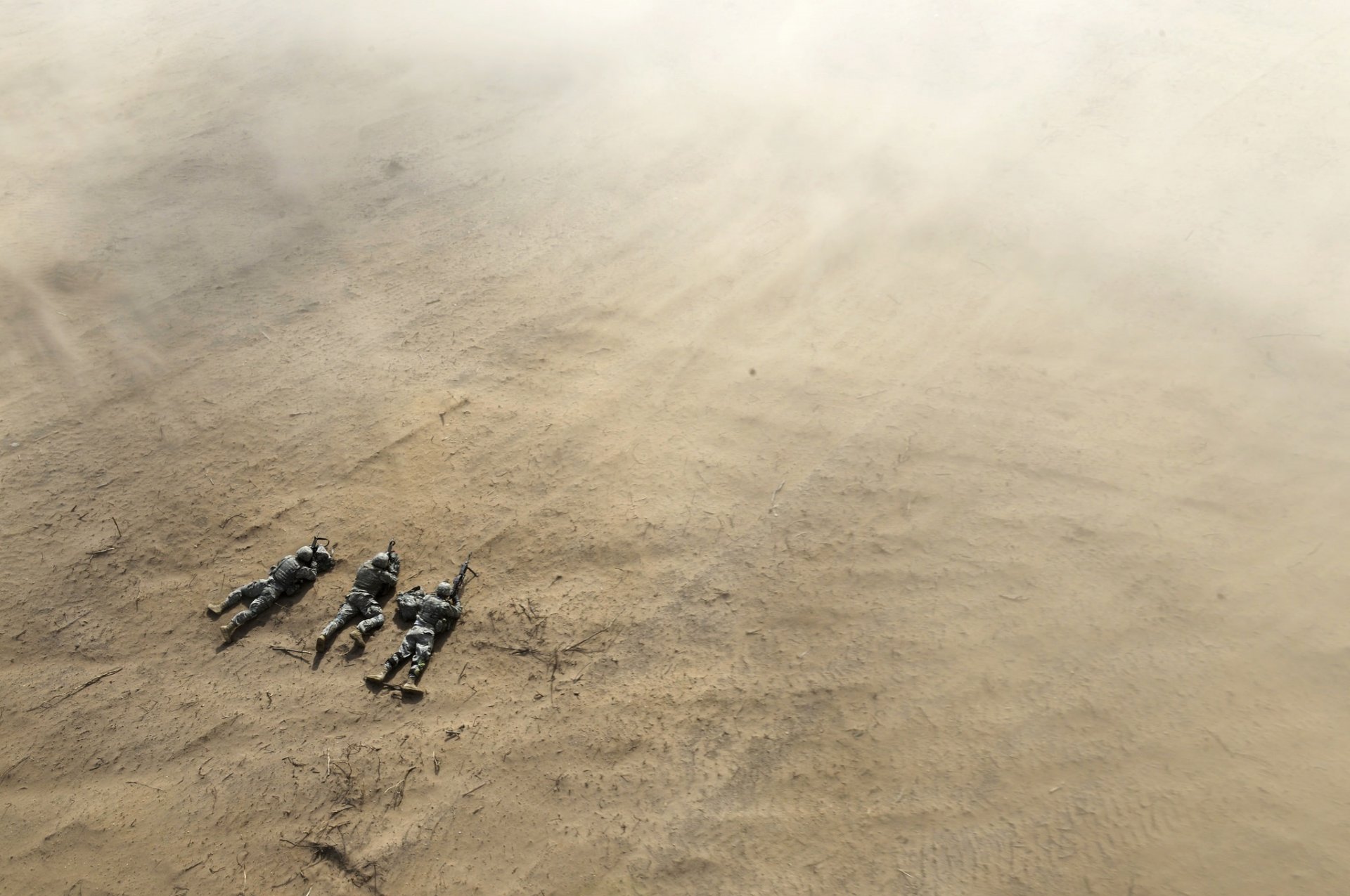 Ein einsamer bewaffneter Soldat auf dem Feld