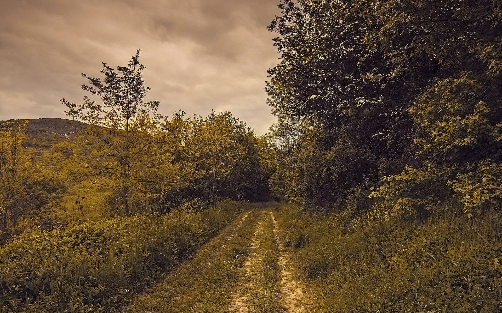 Eine landschaft aus einem baum , einem feld und einem himmelEine Landschaft aus einem Baum , einem Feld und einem Himmel