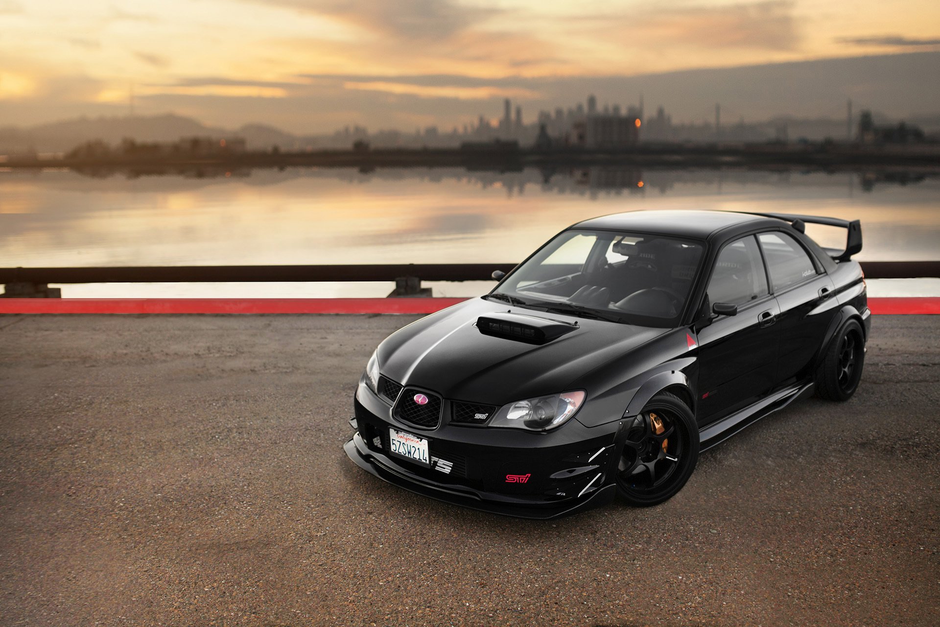 Blauer subaru impreza auf einer betonstraße vor dem hintergrund der hügelBlauer Subaru impreza auf einer Betonstraße vor dem Hintergrund der Hügel