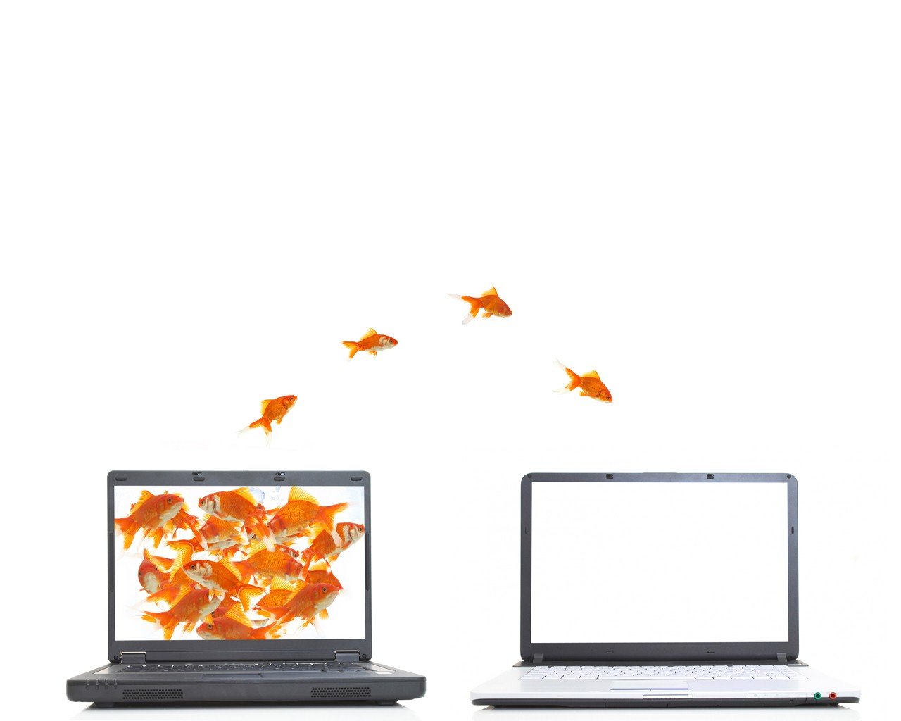 Goldfische springen von einem schwarzen laptop zu einem weißenGoldfische springen von einem schwarzen Laptop zu einem weißen