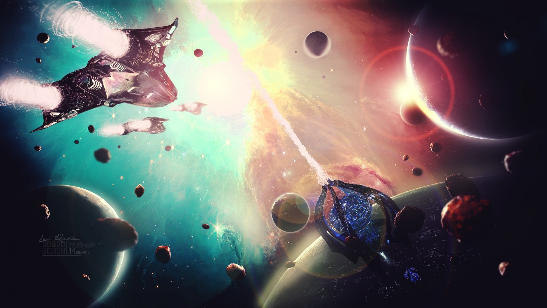 Atmosphärische kunst mit planeten und raumschiffenAtmosphärische Kunst mit Planeten und Raumschiffen