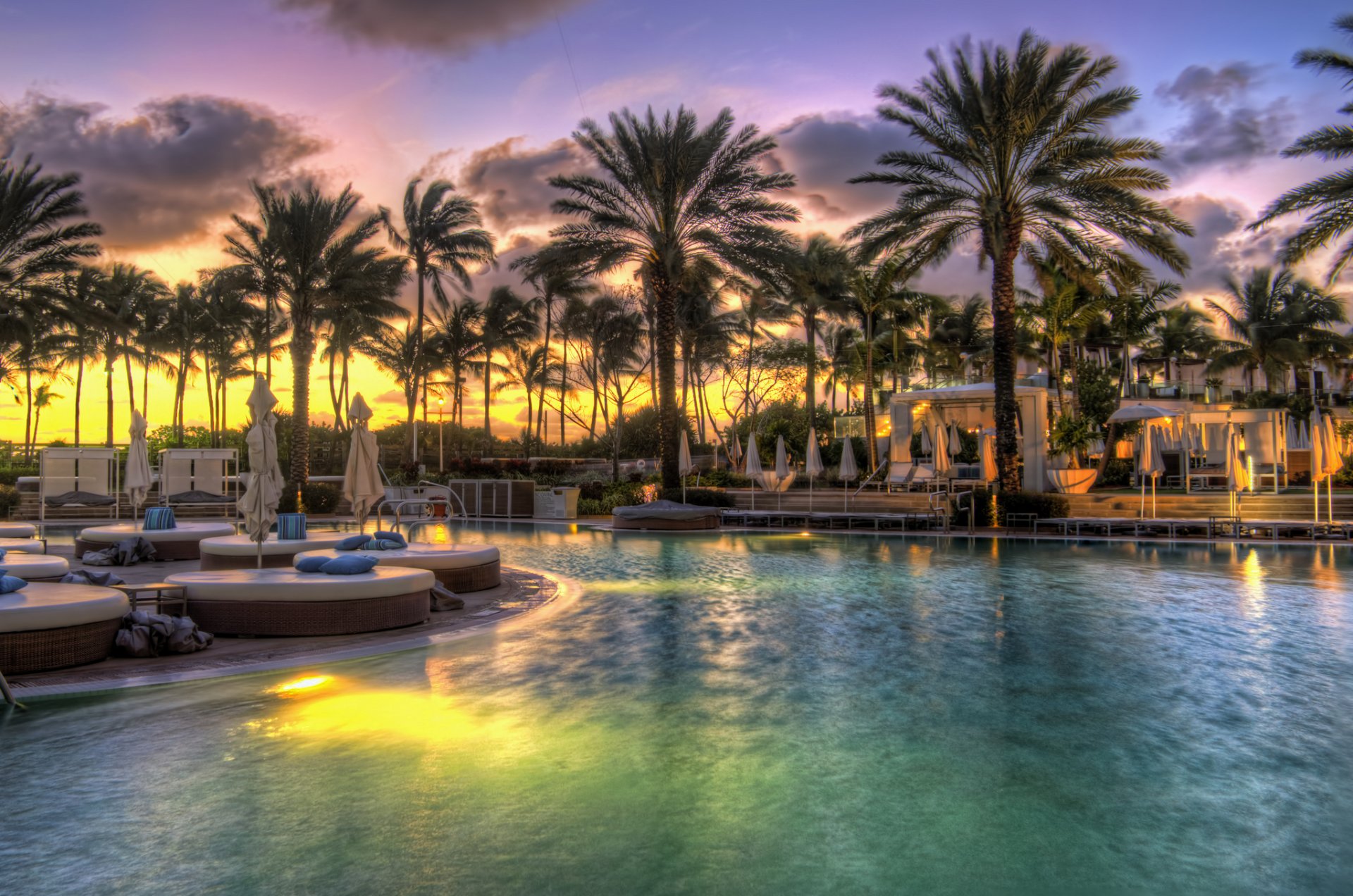 Palmen am pool vor sonnenuntergang himmel hintergrundPalmen am Pool vor Sonnenuntergang Himmel Hintergrund