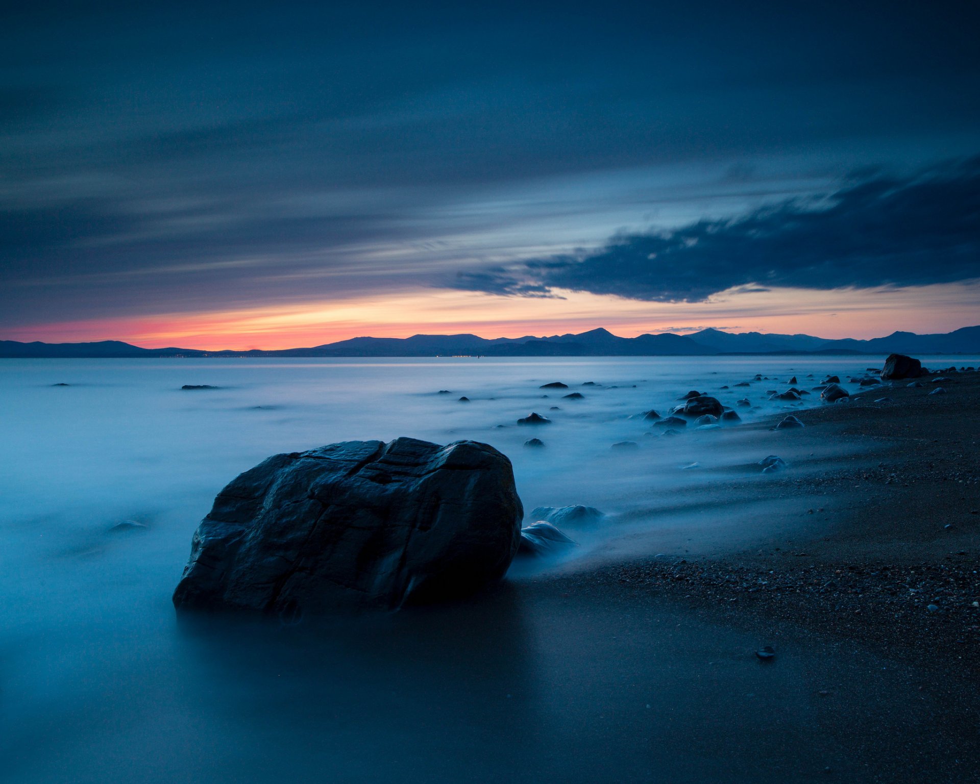 Sonnenuntergang am meer. leerer strand mit steinenSonnenuntergang am Meer. Leerer Strand mit Steinen