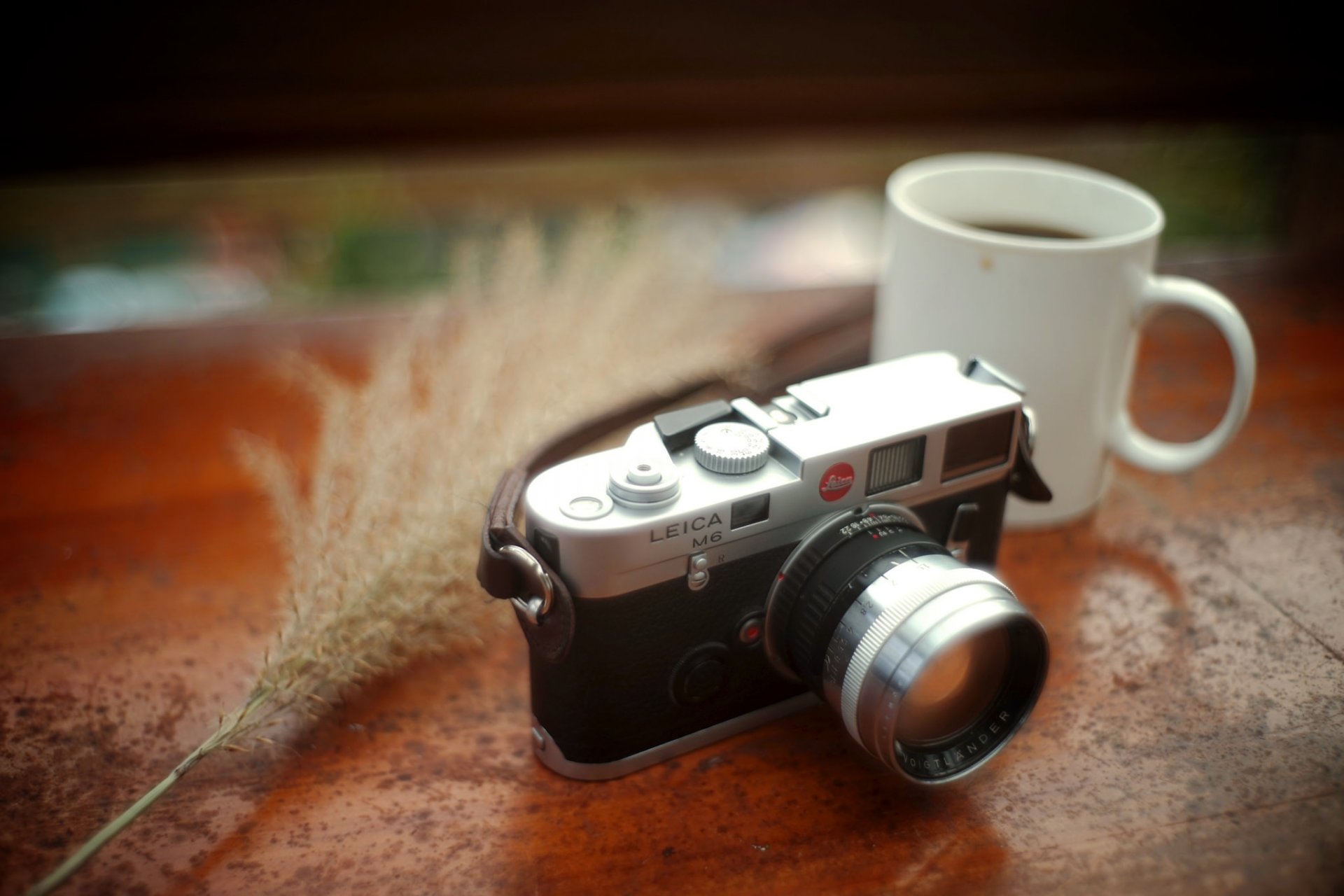 Leica Schwarz-Silber-Kamera mit Kordelzug auf dem Tisch mit Kaffeetafel