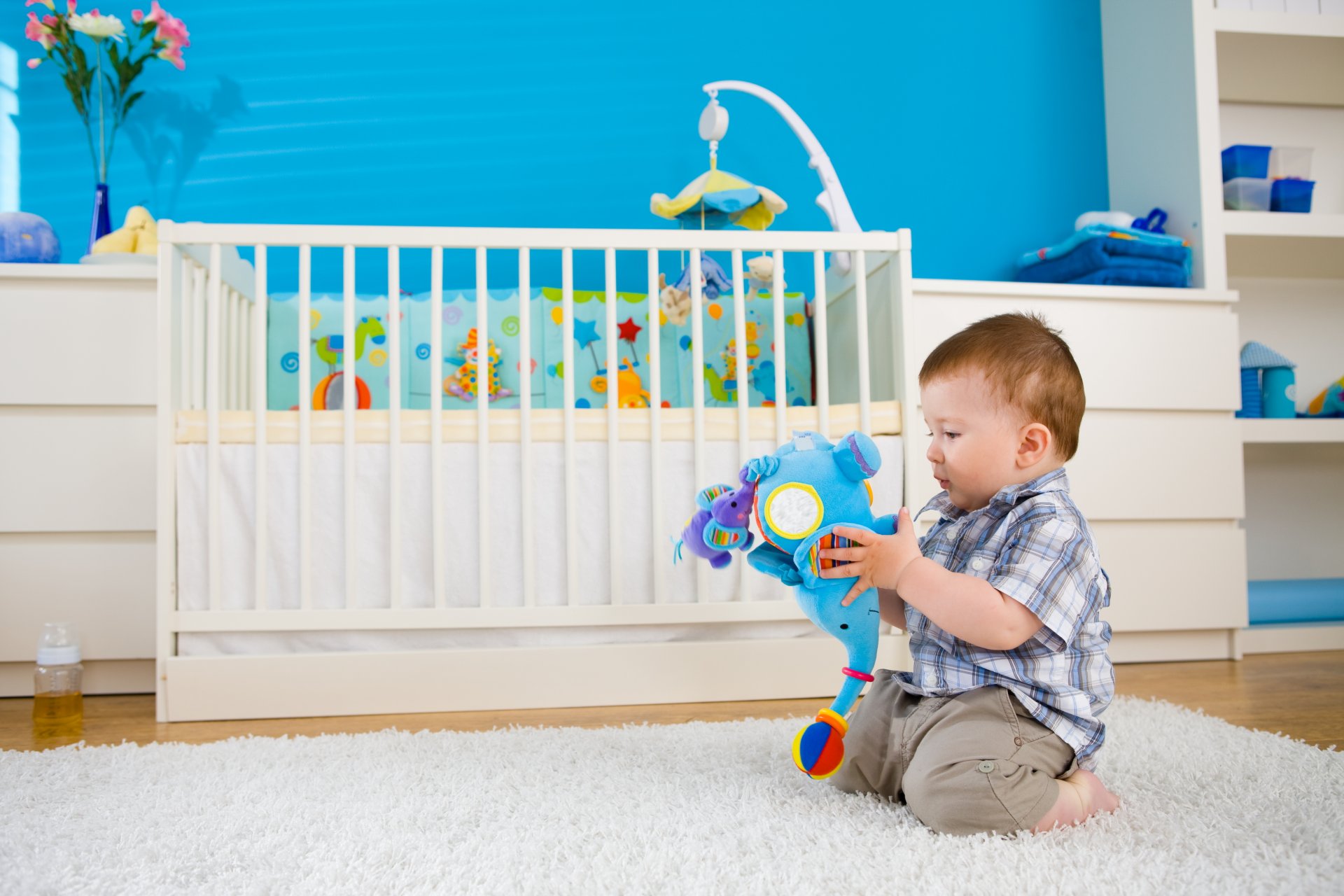 Ein kleiner Junge auf einem weißen Teppich mit einem Elefanten in den Händen