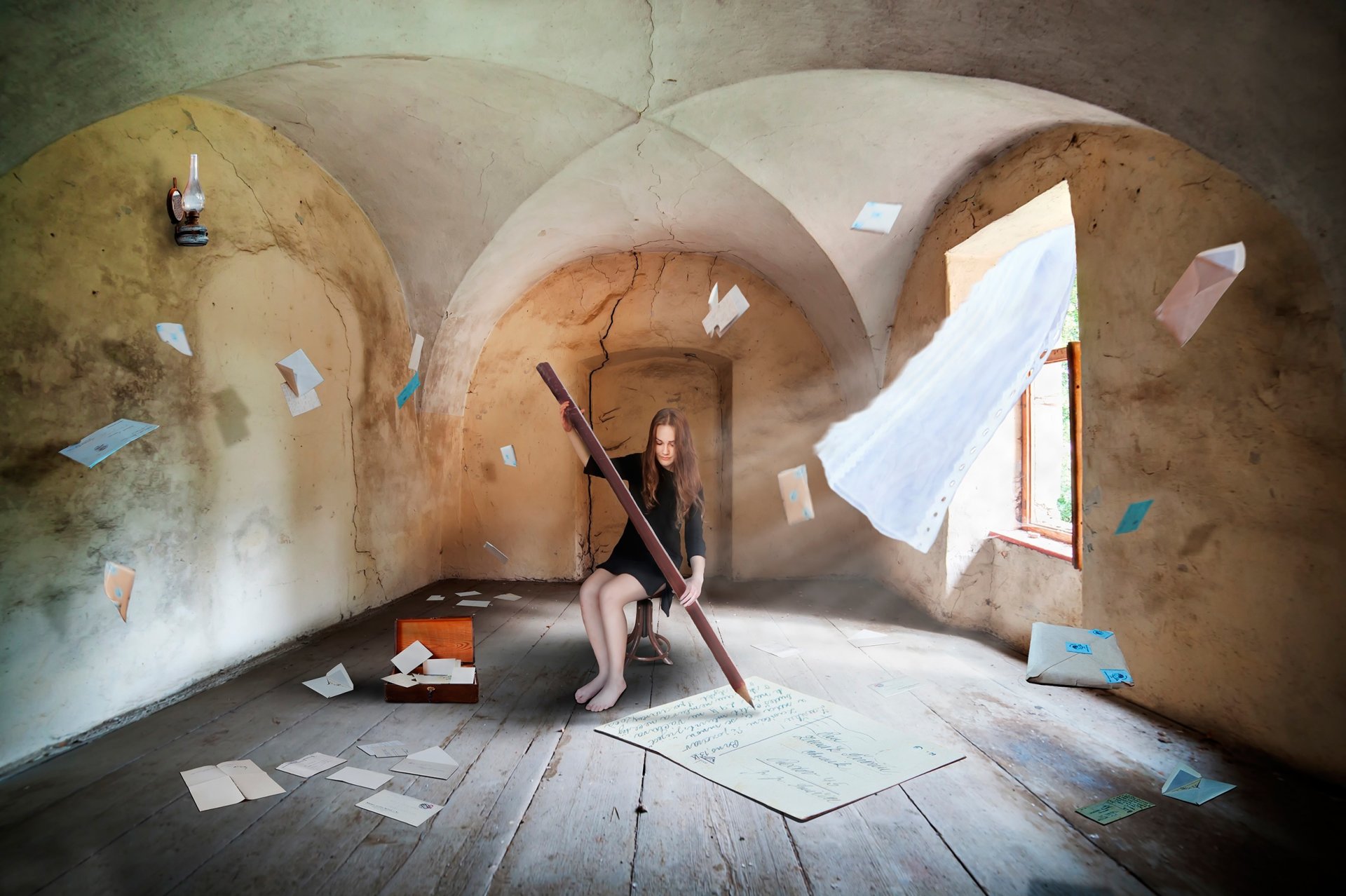 Mädchen mit Haaren in Flammen gegenüber einer Krähe