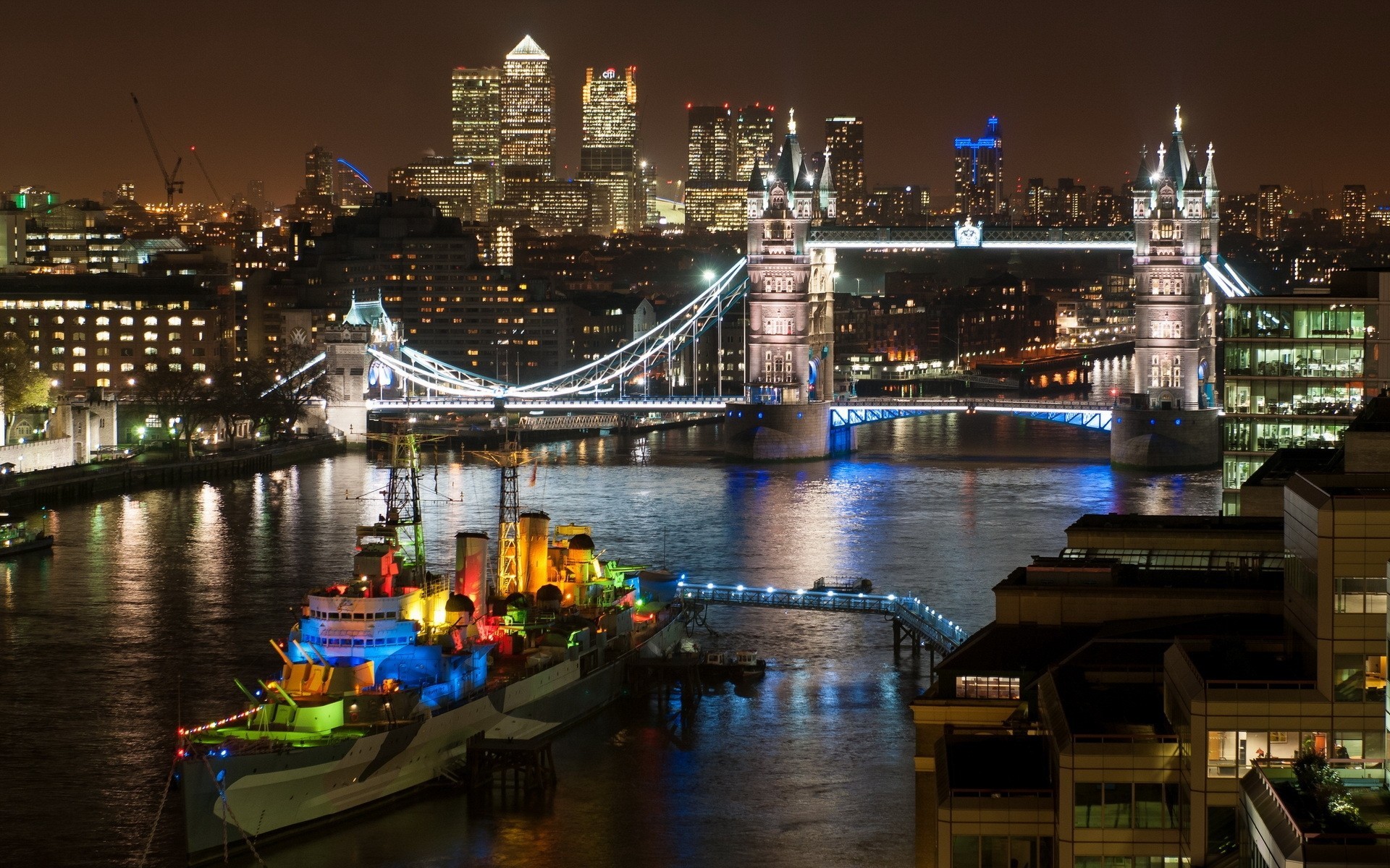 Schickes Schiff legt vor dem Hintergrund der Abendstadt an
