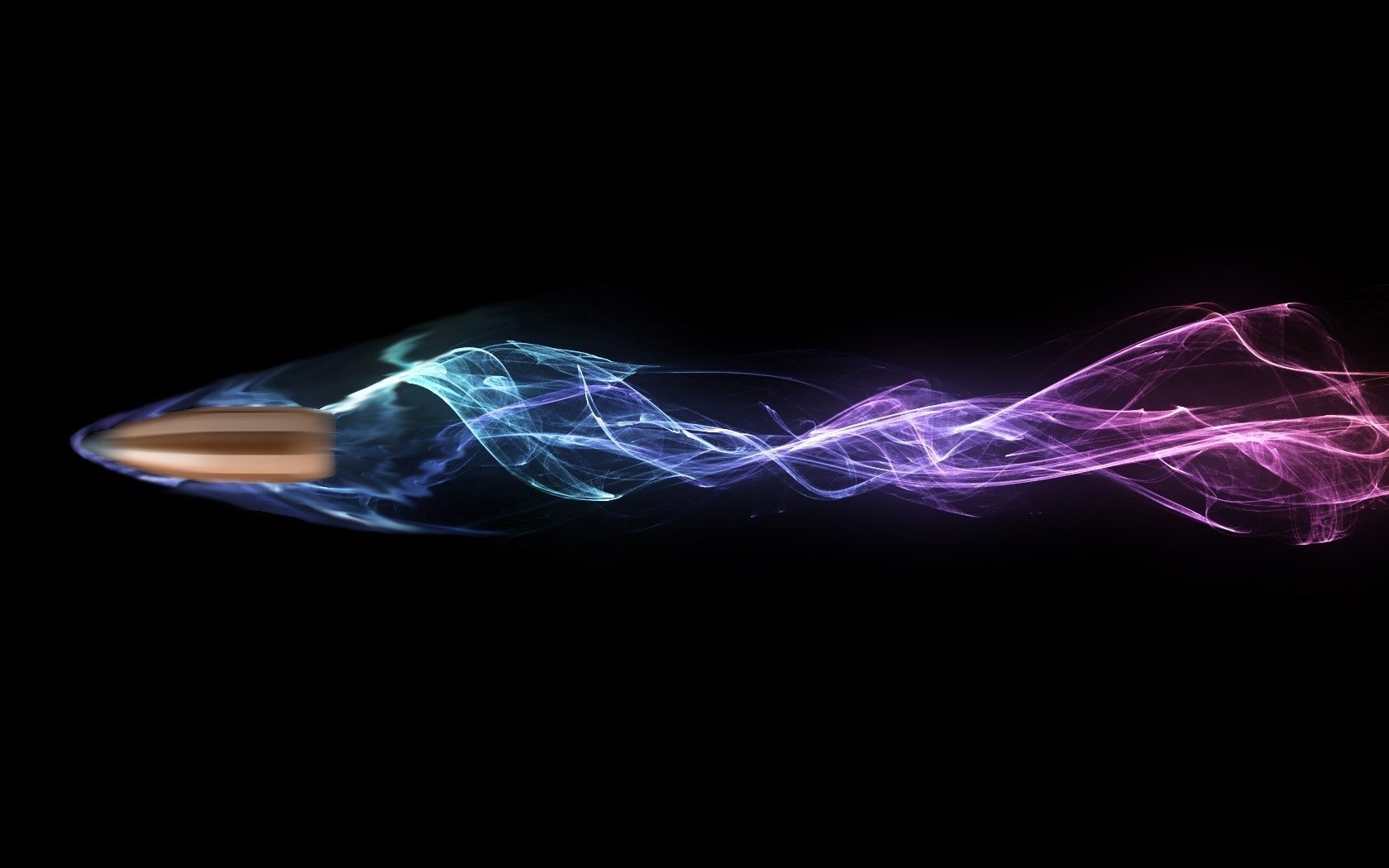 Auf schwarzem Hintergrund eine fliegende Kugel mit einer bunten Spur