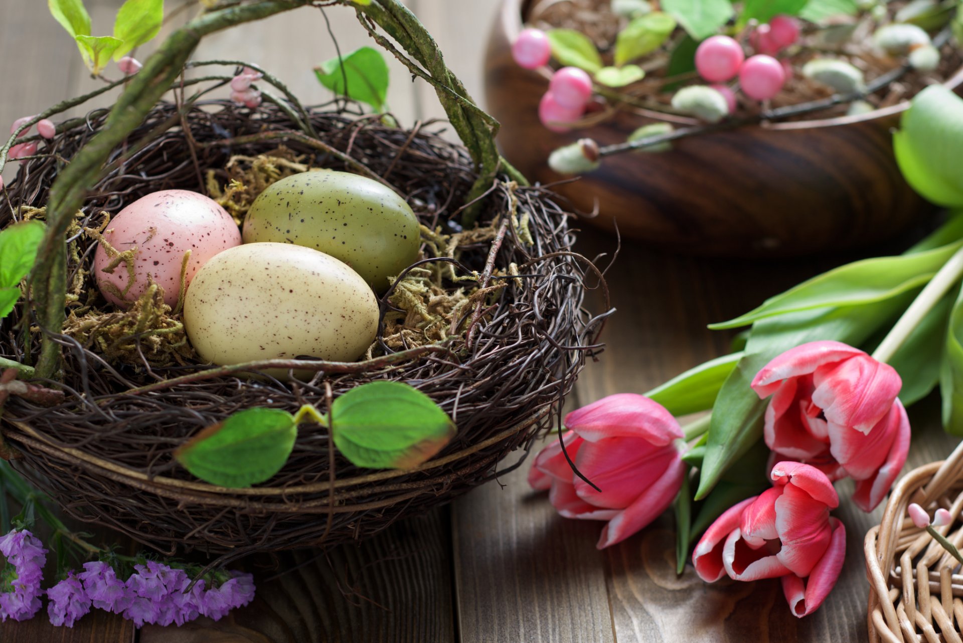 Zwei helle eimer, gefärbte ostereier und narzissenZwei helle Eimer, gefärbte Ostereier und Narzissen