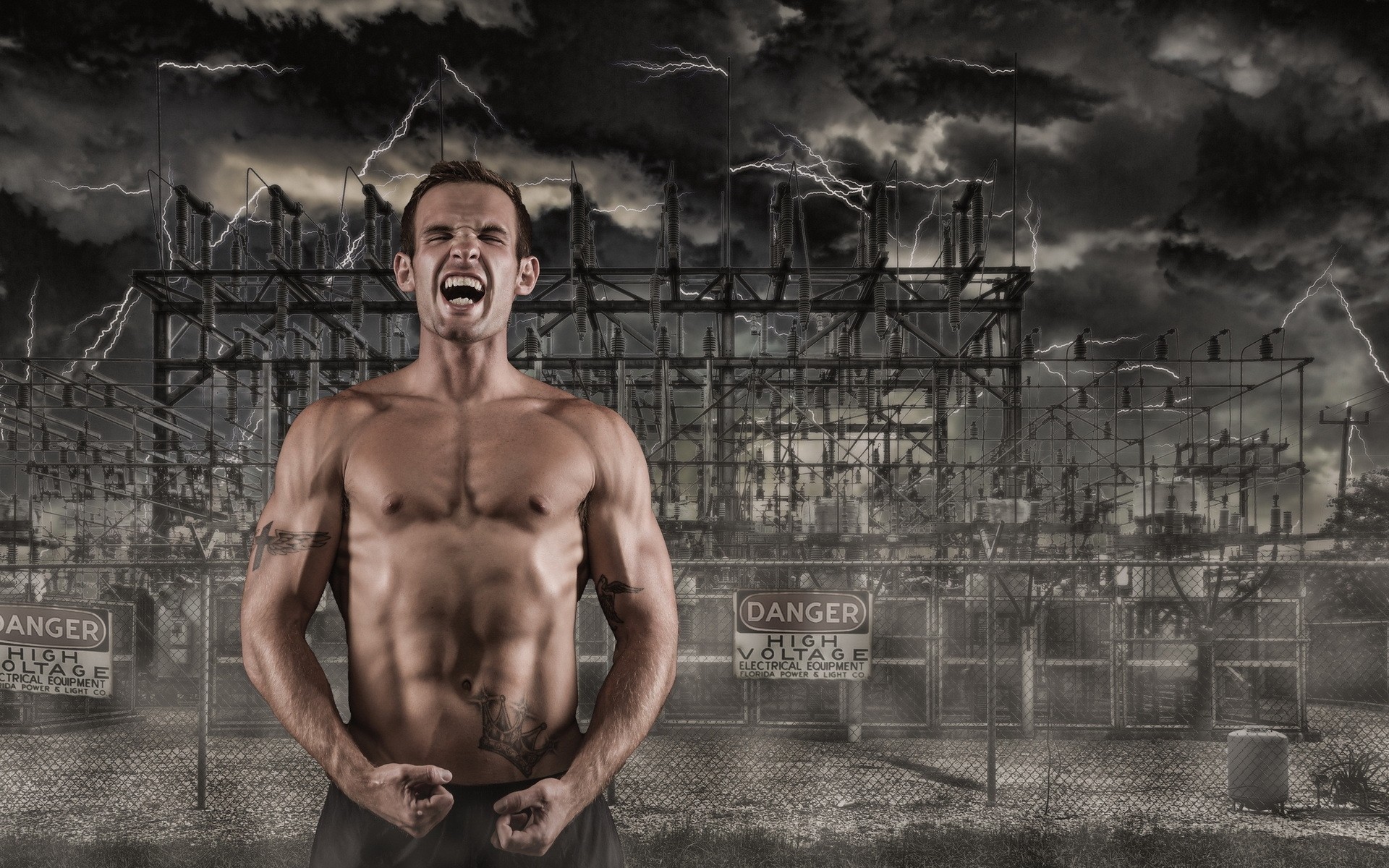 Die Muskeln eines Mannes, der sich im Sand niederschlägt