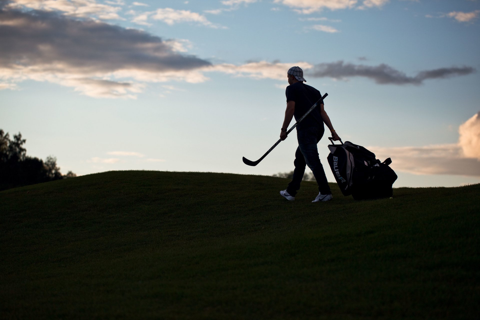 Auf hellem Himmelshintergrund ein Bild eines Sportlers mit einem Putter