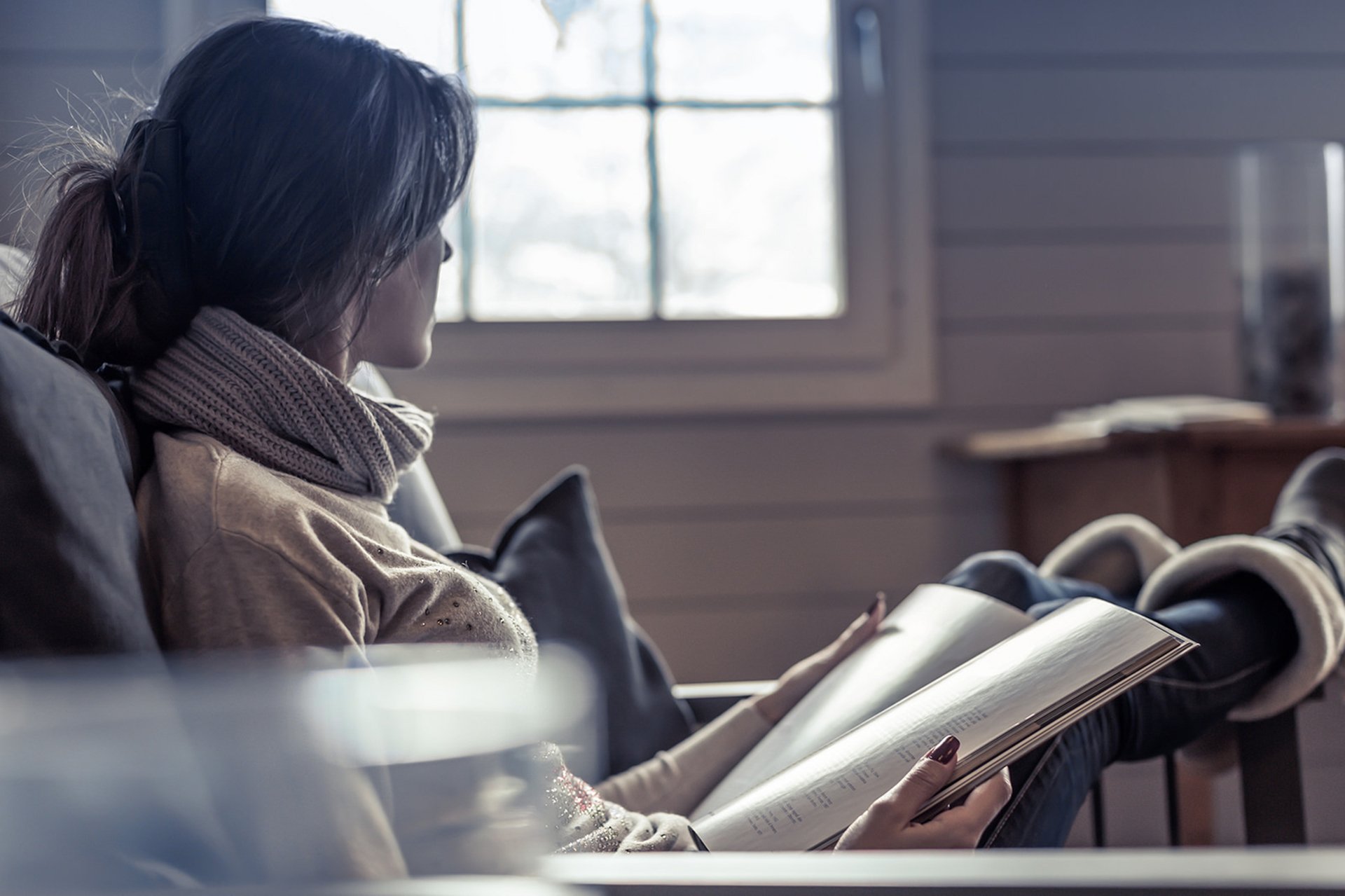 Das mädchen sitzt auf einem stuhl und liest eine zeitschriftDas Mädchen sitzt auf einem Stuhl und liest eine Zeitschrift
