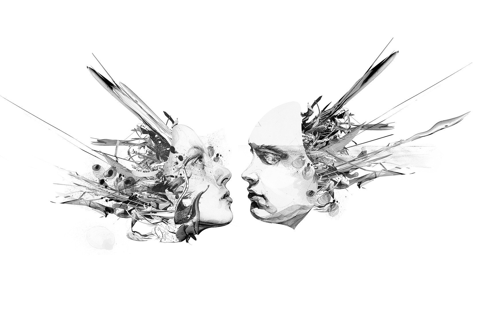 Weiße Silhouetten von Mann und Frau in Form von Spritzern auf dunklem Yon