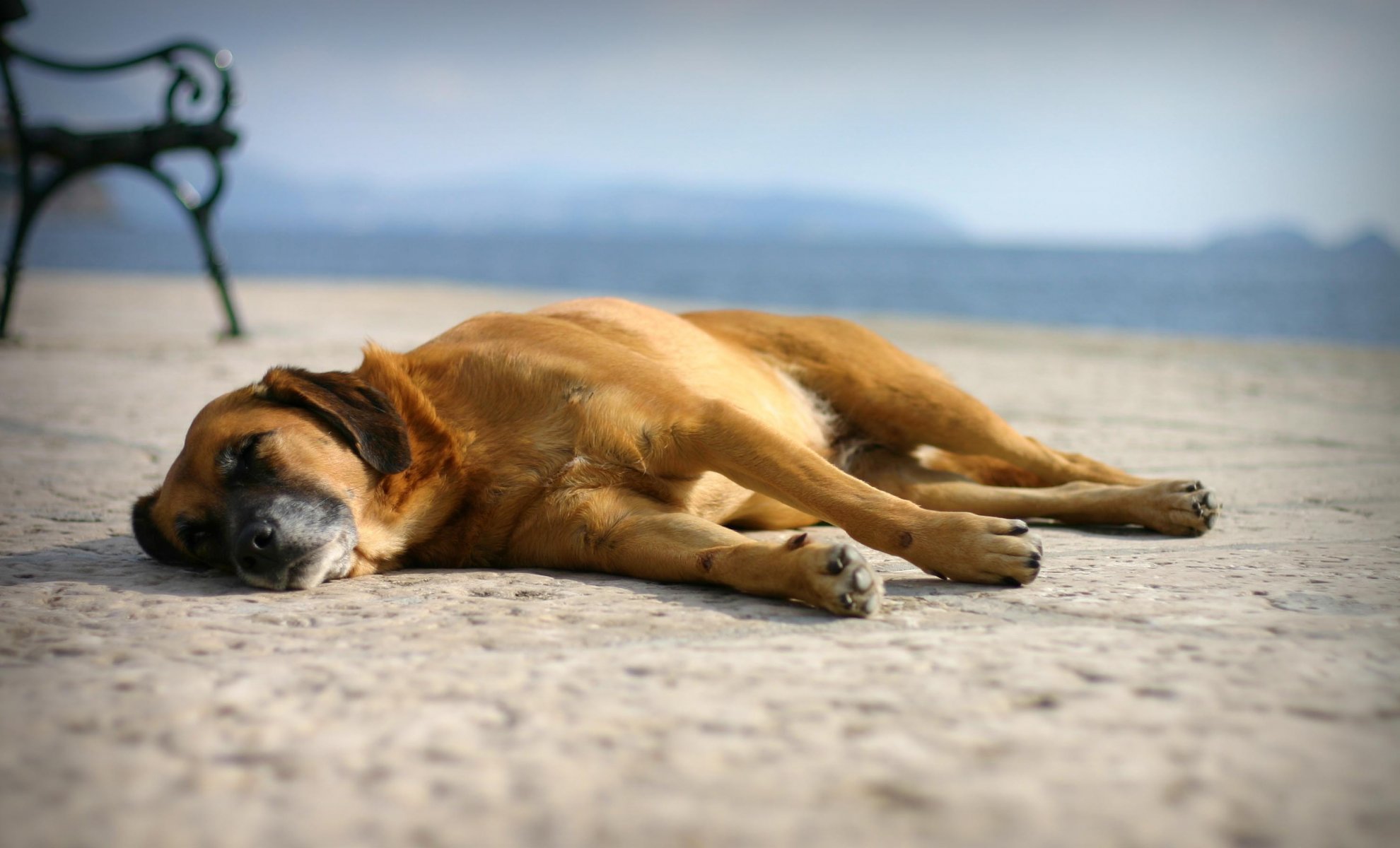 Der Hund liegt am Strand im Sand, schläft und träumt