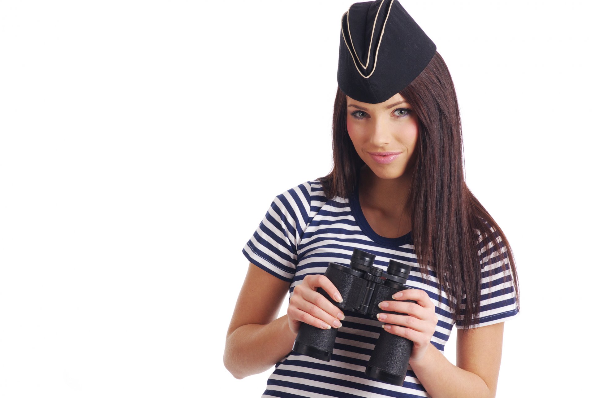 Mädchen in einem gestreiften Matrosenanzug mit einem Fernglas in den Händen