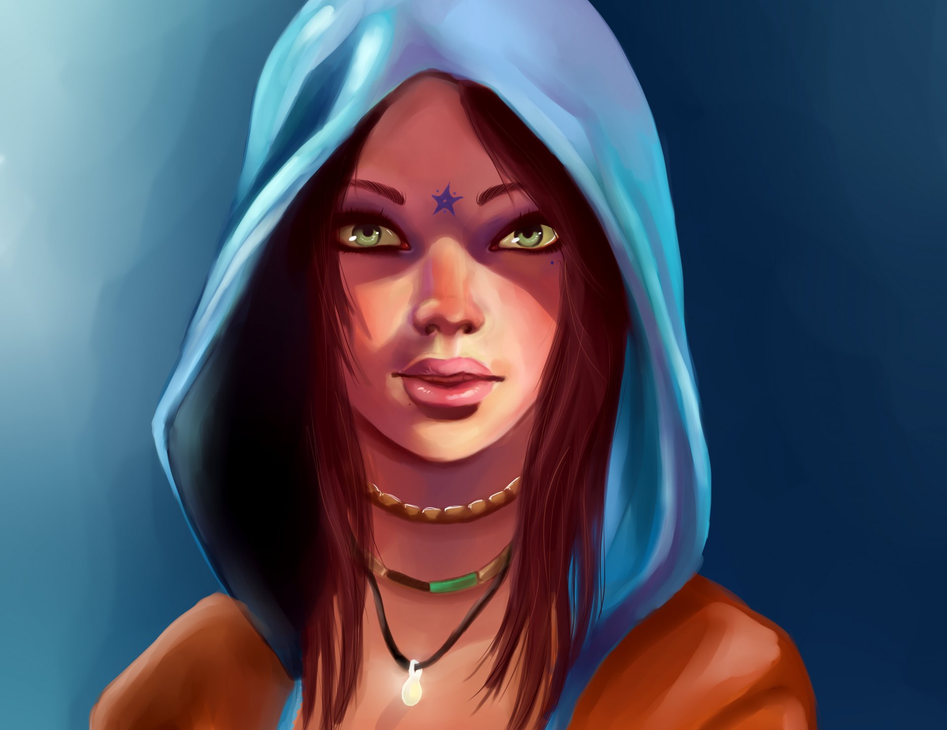 Ein grünäugiges mädchen in einer blauen kapuze und einem blauen sternchen auf der stirnEin grünäugiges Mädchen in einer blauen Kapuze und einem blauen Sternchen auf der Stirn