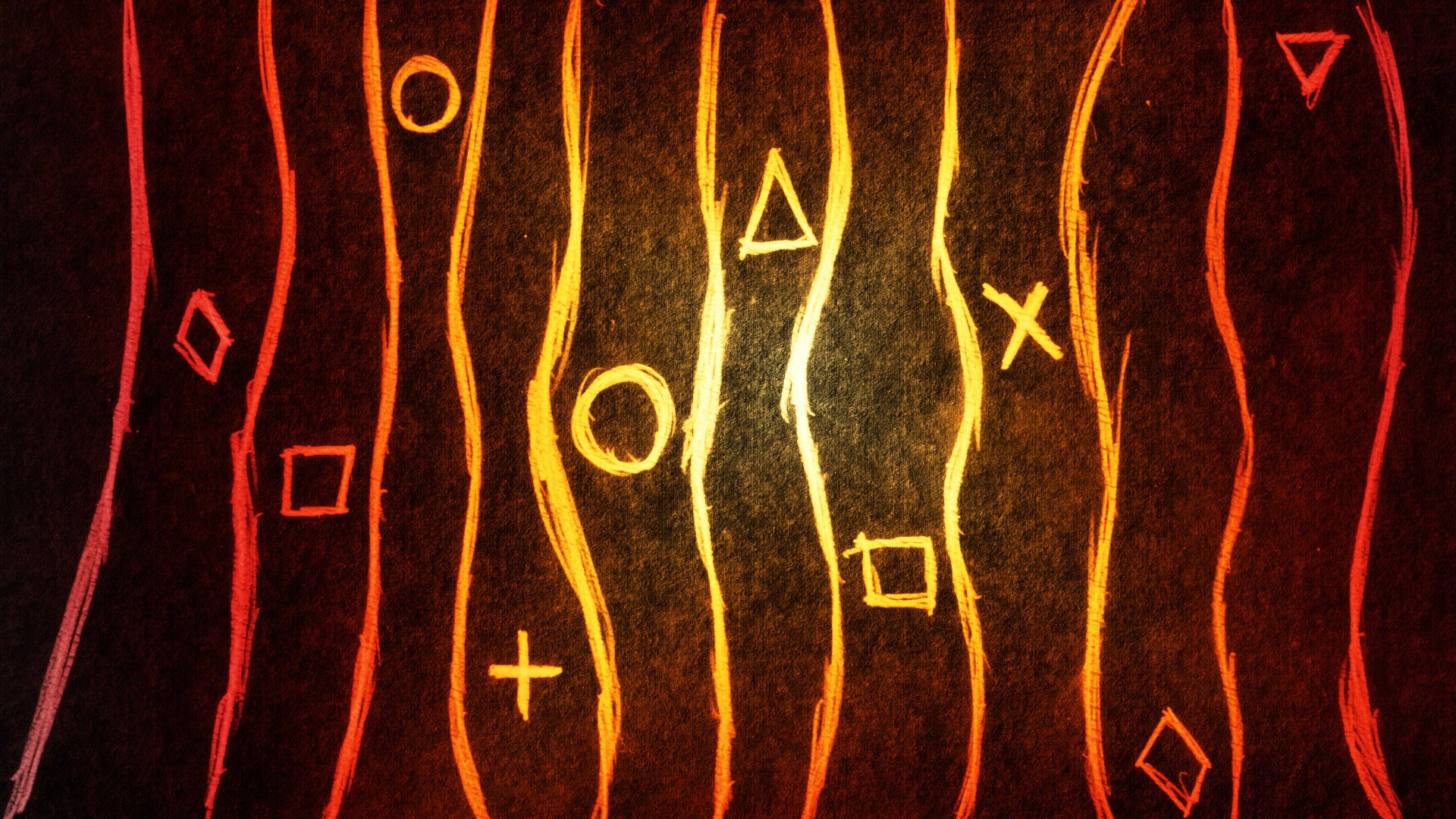 Auf dem braunen fonk sind rote, gelbe wellige streifen zu sehen. pluspunkte, kreise, quadrate, rauten dazwischenAuf dem braunen Fonk sind rote, gelbe wellige Streifen zu sehen. Pluspunkte, Kreise, Quadrate, Rauten dazwischen